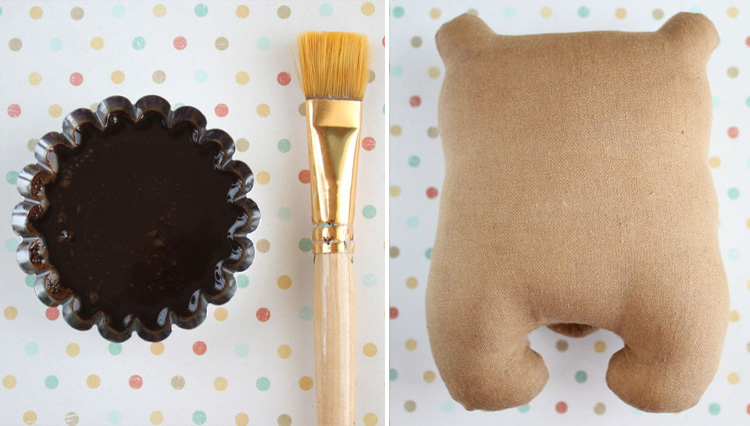 - Pegue uma escova, com uma largura de 10 cm, mergulhe na solução e aplique no brinquedo. É melhor não tocar no fundo do prato para que as borras de café não estejam no brinquedo.