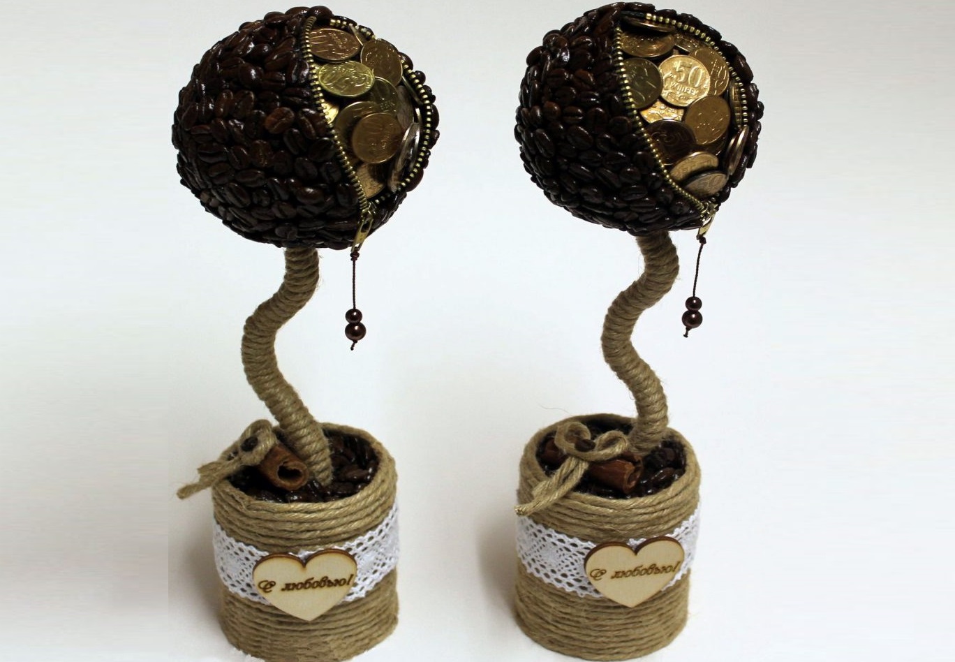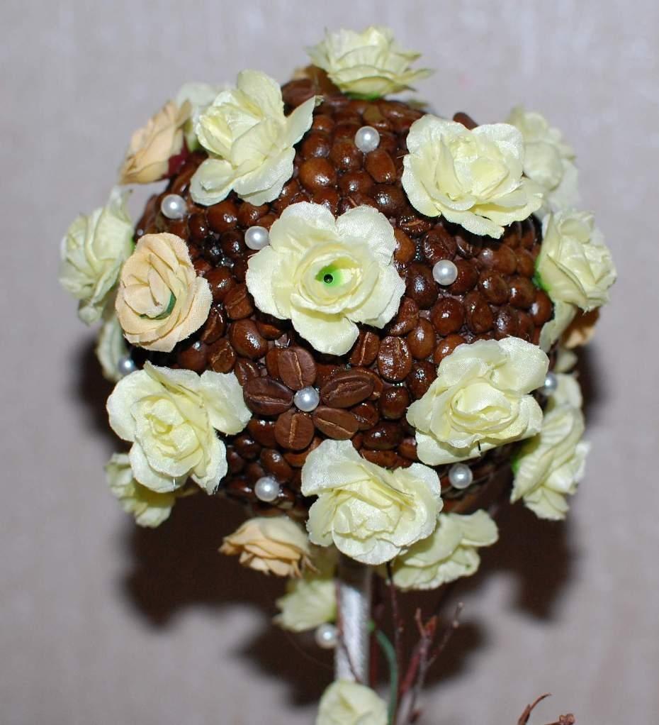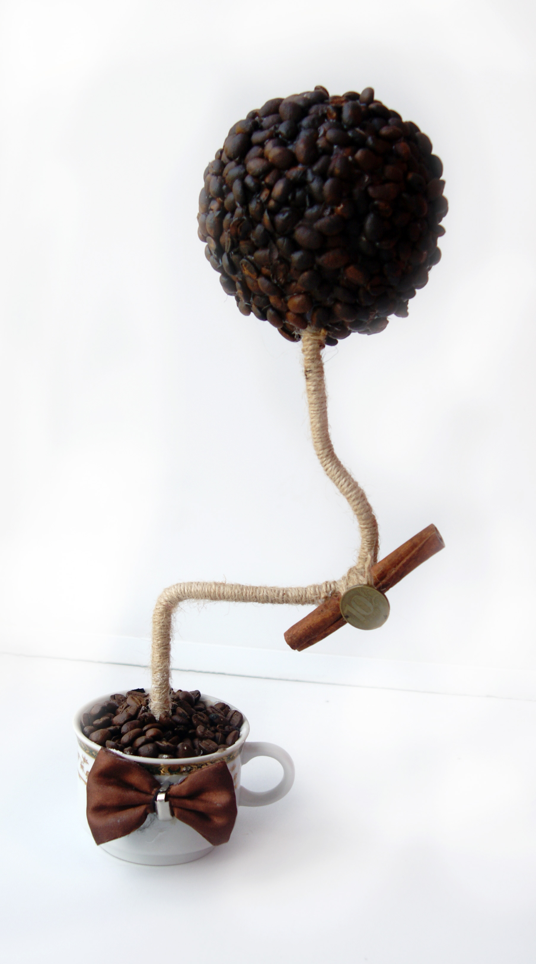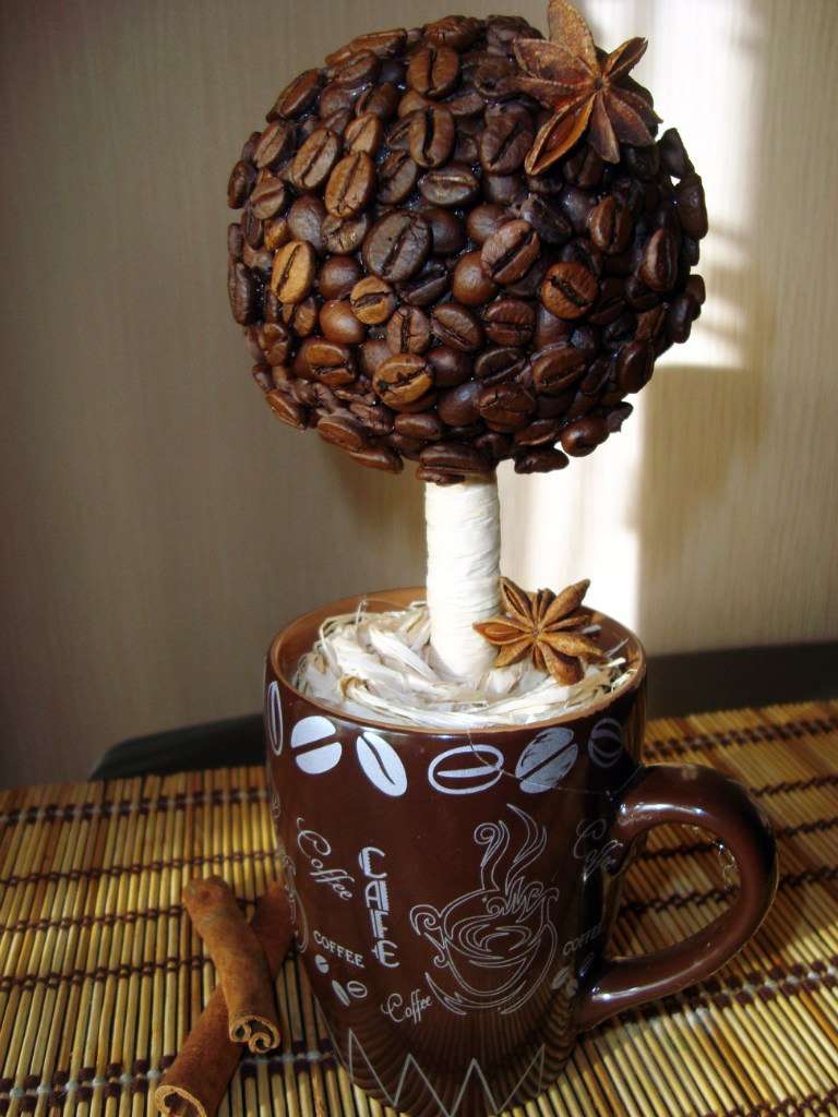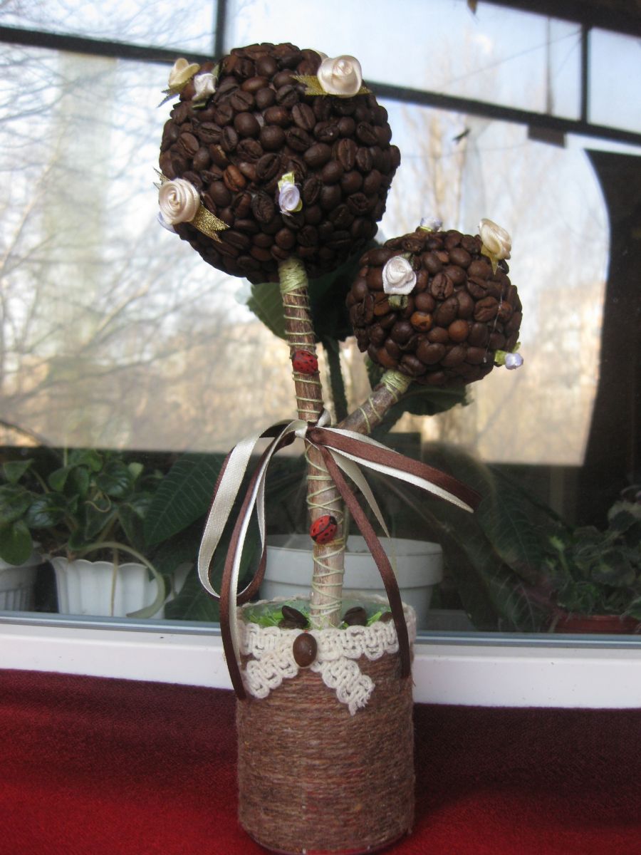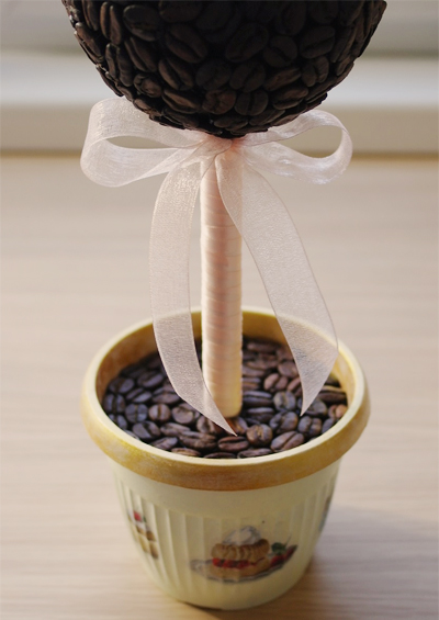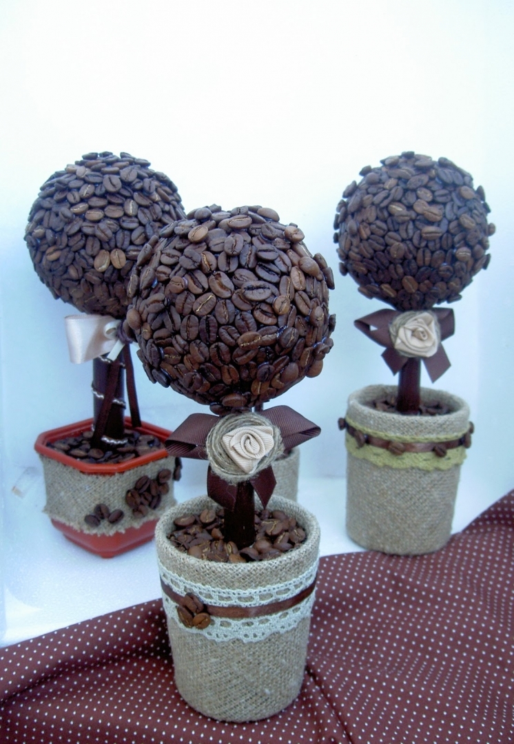 No final, você começa topiariy em uma perna grossa com uma coroa redonda de grãos de café. Se você quiser adicionar uma aparência solene à composição, elementos adicionais na forma de fitas, rendas, brilhos ou pedrinhas são usados para isso.