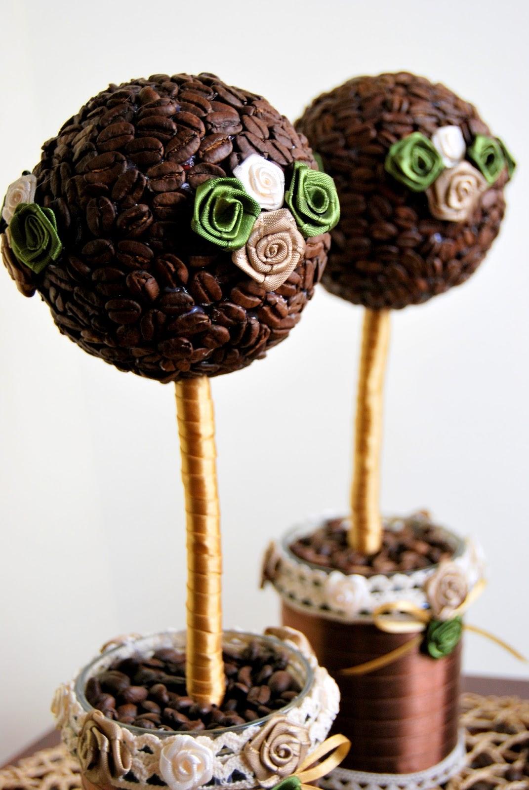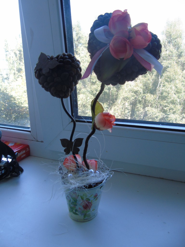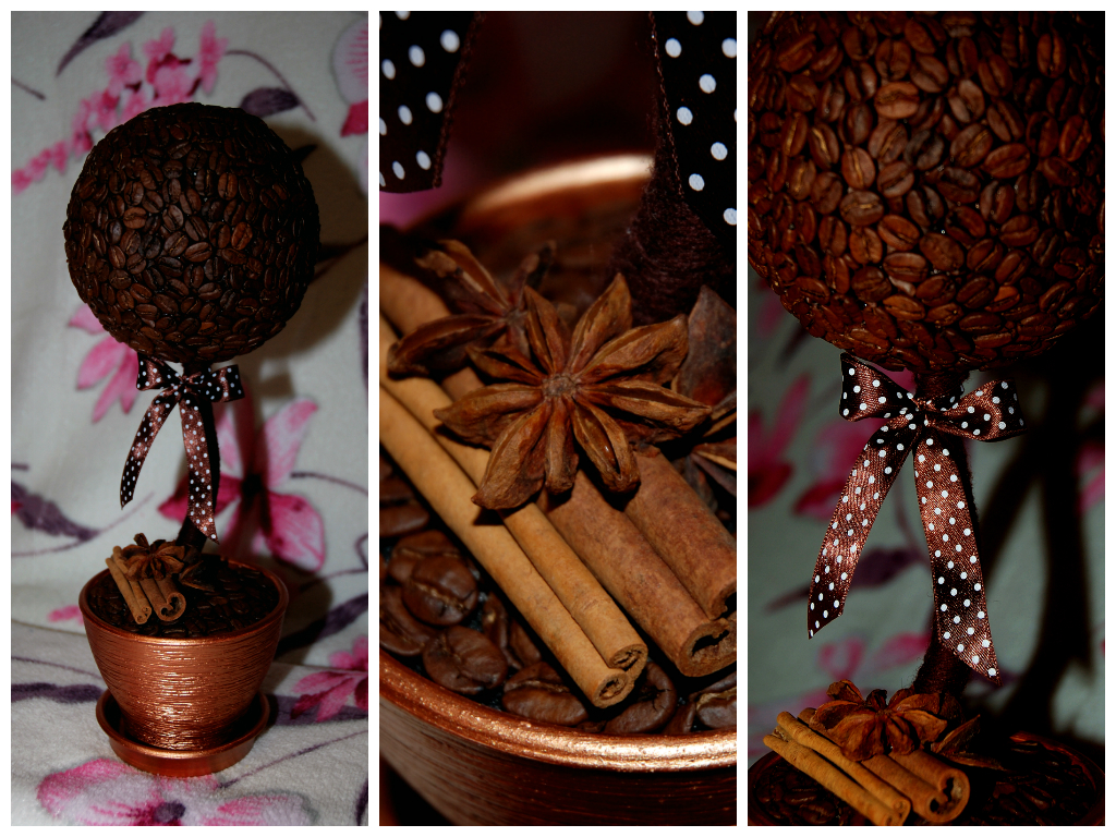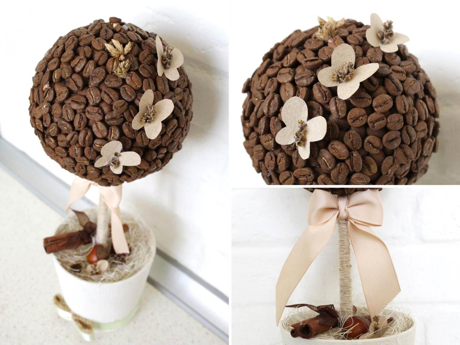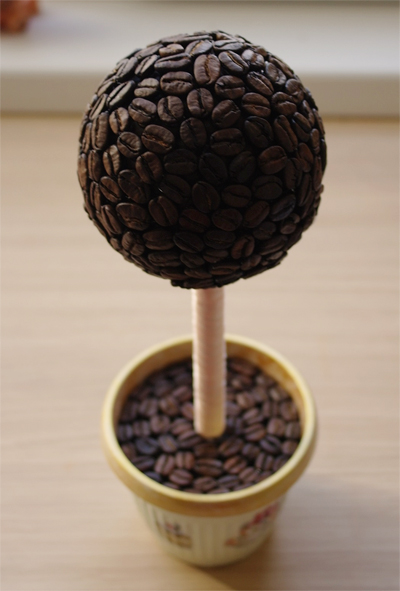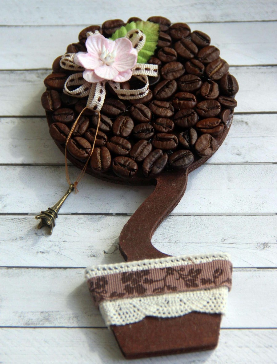 No final, você começa topiariy em uma perna grossa com uma coroa redonda de grãos de café. Se você quiser adicionar uma aparência solene à composição, elementos adicionais na forma de fitas, rendas, brilhos ou pedrinhas são usados para isso.