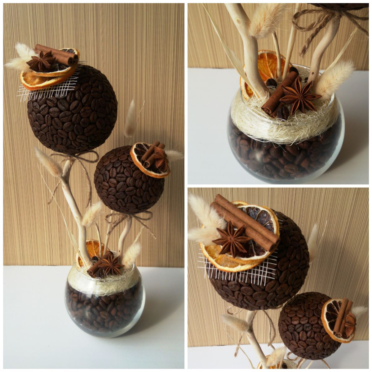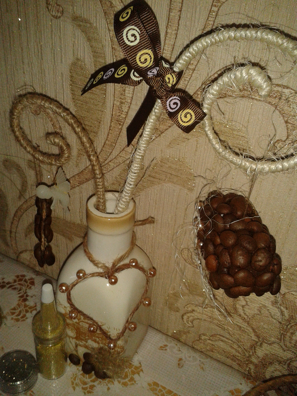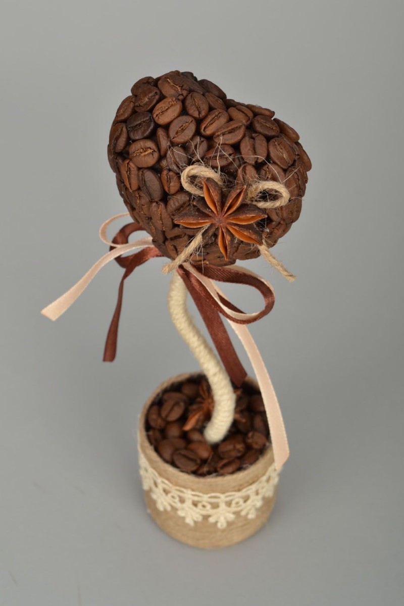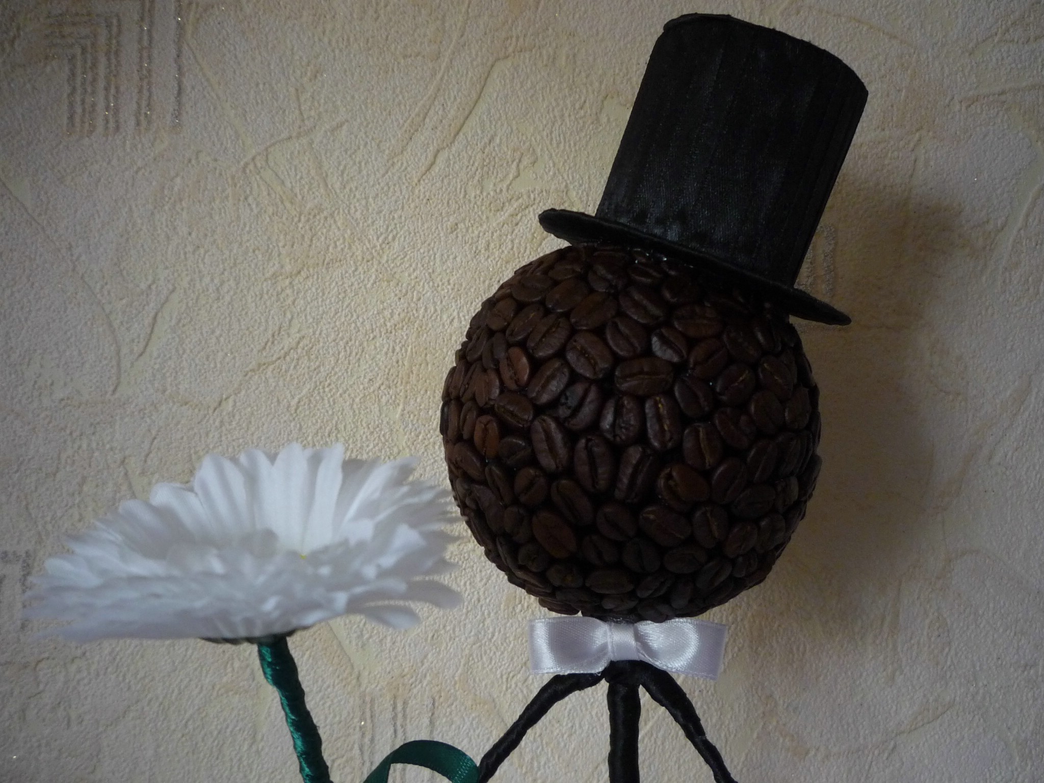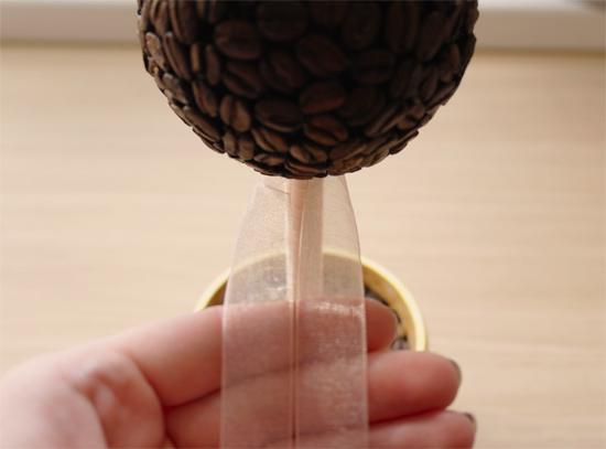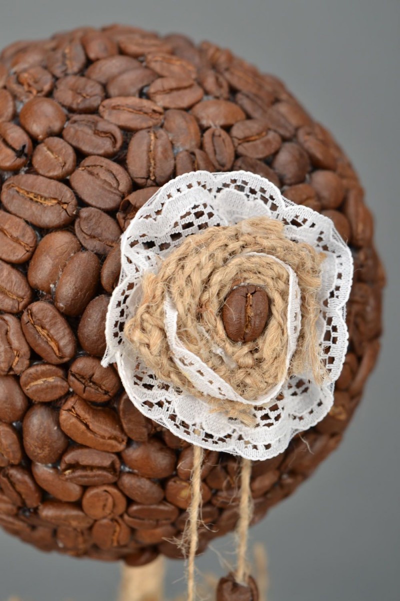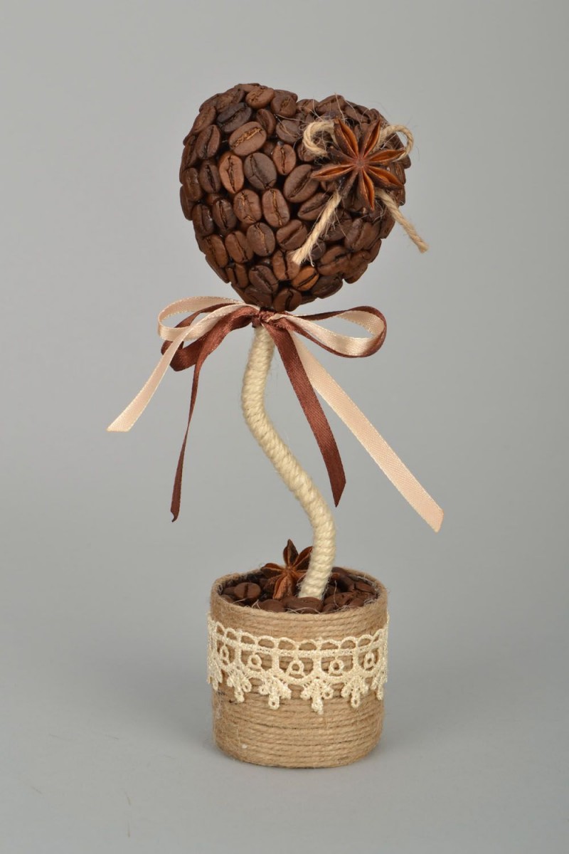 No final, você começa topiariy em uma perna grossa com uma coroa redonda de grãos de café. Se você quiser adicionar uma aparência solene à composição, elementos adicionais na forma de fitas, rendas, brilhos ou pedrinhas são usados para isso.