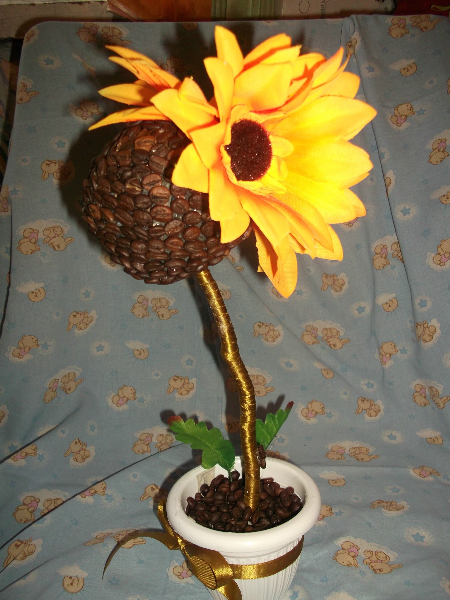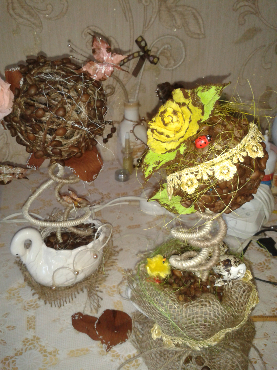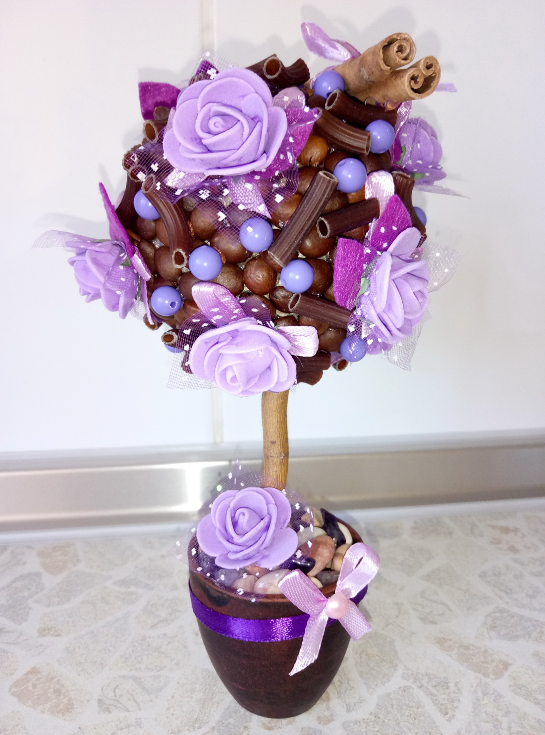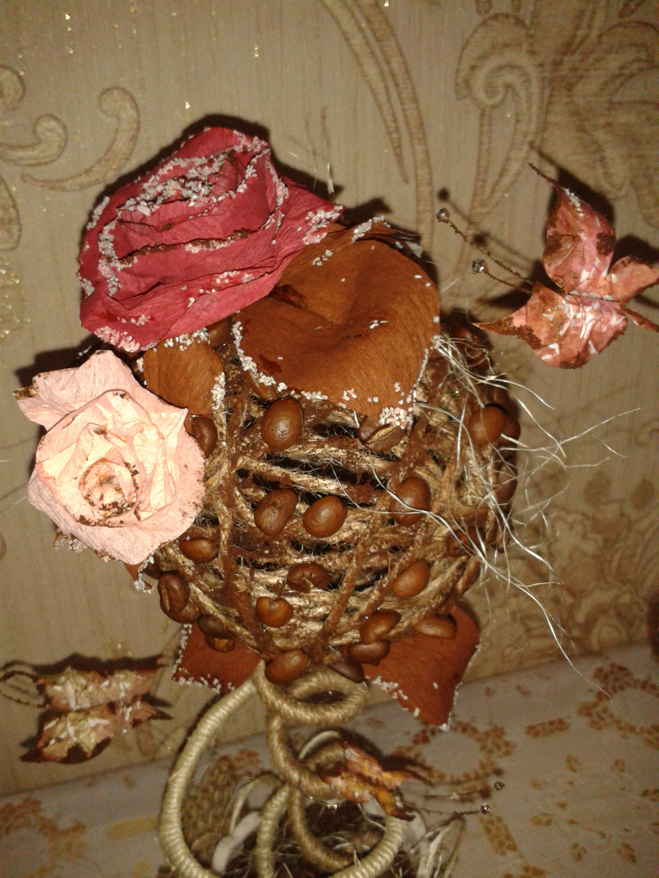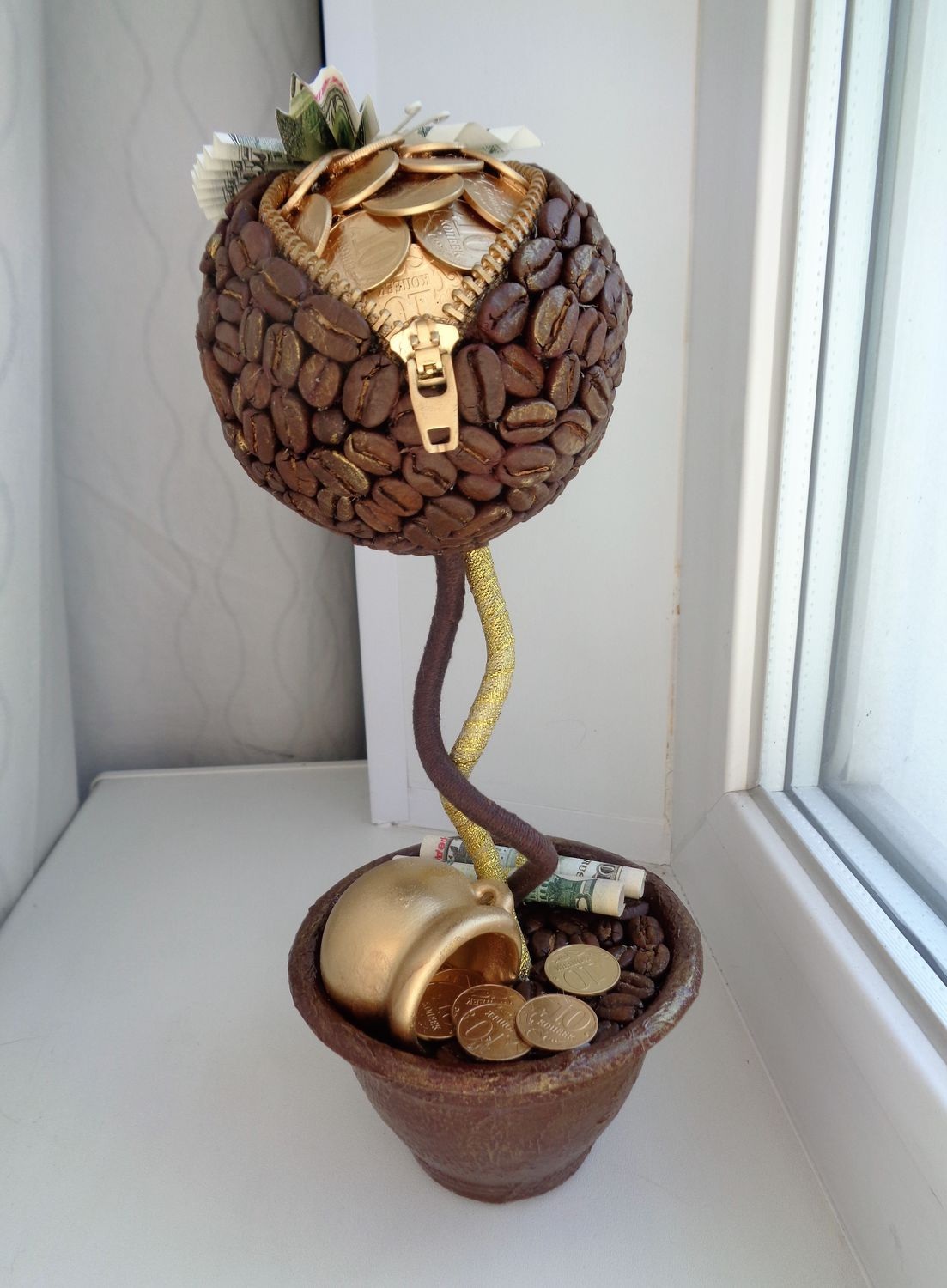 No final, você começa topiariy em uma perna grossa com uma coroa redonda de grãos de café. Se você quiser adicionar uma aparência solene à composição, elementos adicionais na forma de fitas, rendas, brilhos ou pedrinhas são usados para isso.