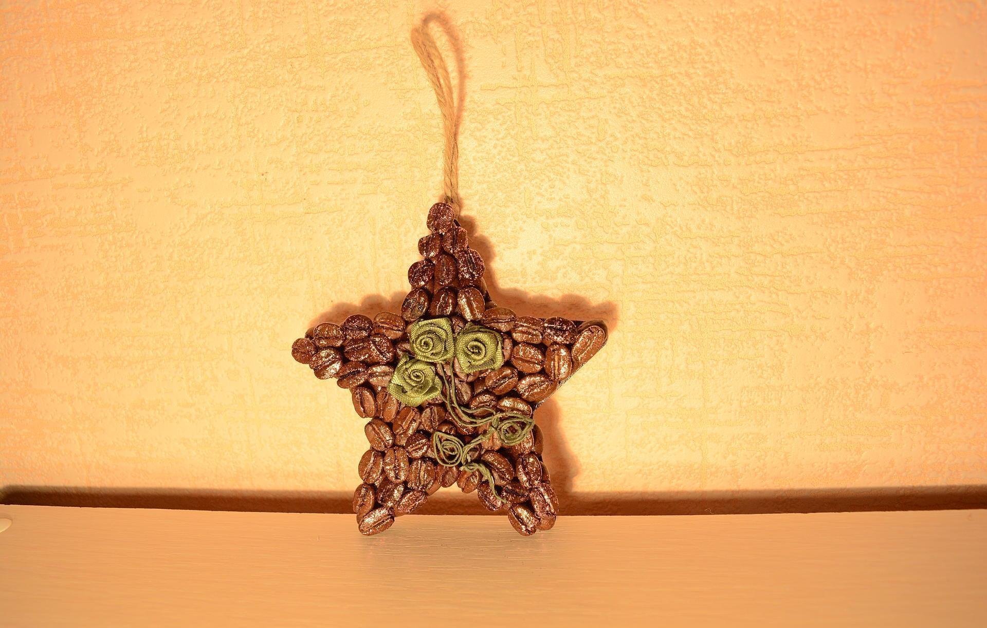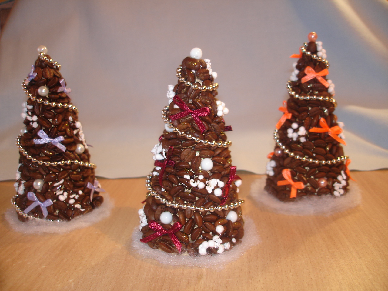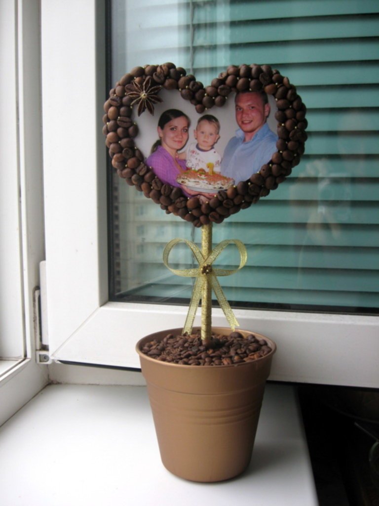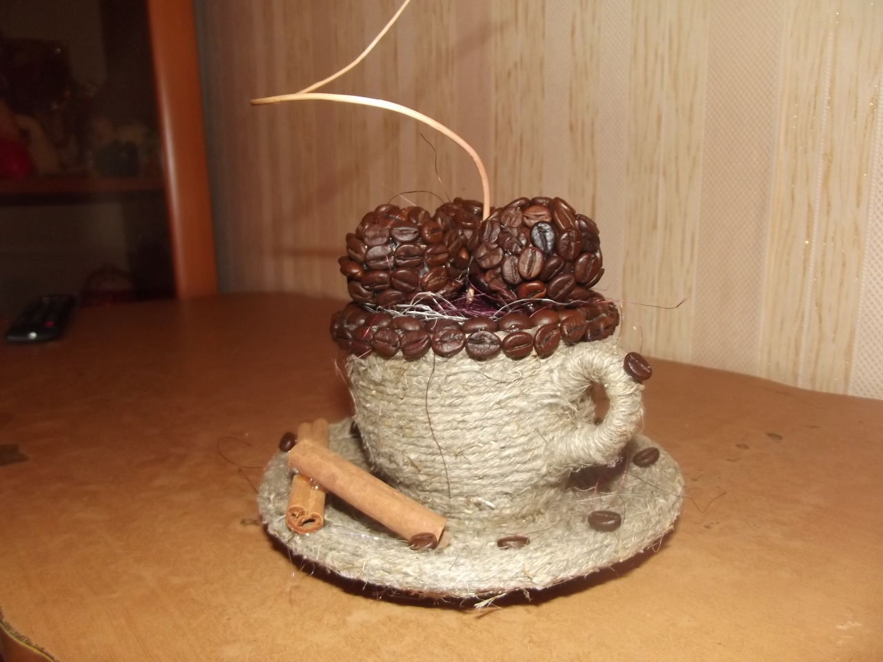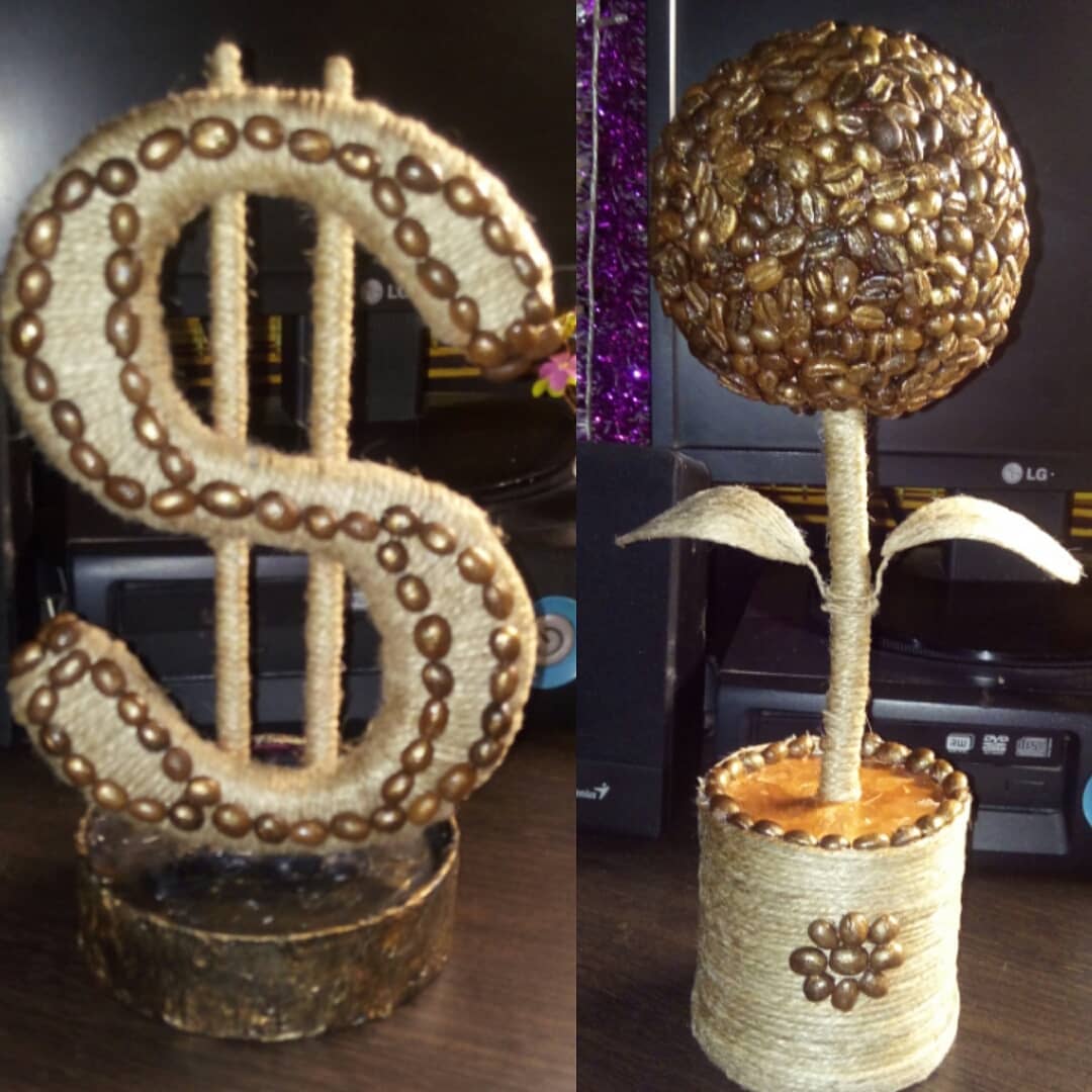 No final, você começa topiariy em uma perna grossa com uma coroa redonda de grãos de café. Se você quiser adicionar uma aparência solene à composição, elementos adicionais na forma de fitas, rendas, brilhos ou pedrinhas são usados para isso.