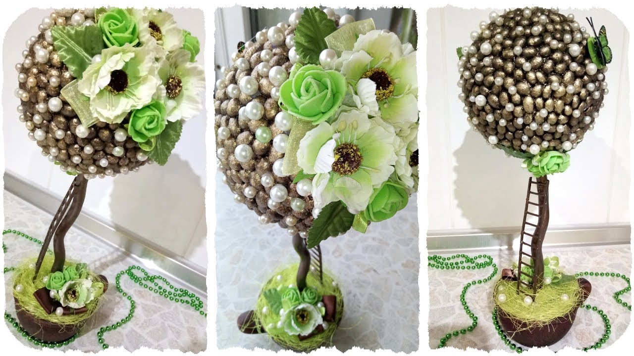 Topiary é colocado em um pote, mas você pode criar uma composição sem ele. Itens adicionais para artesanato são: