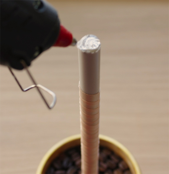 - Para o tronco não parecia chato e monótono, pode ser decorado com fita ou tinta.
