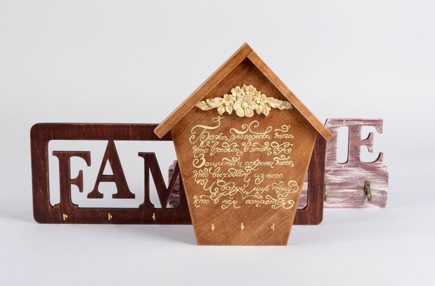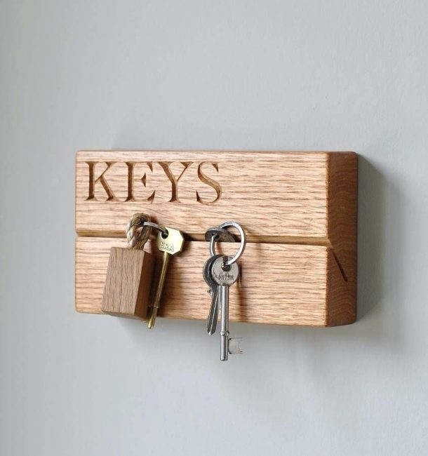 O mais difícil dos detentores de chaves abertas, talvez, isso. Madeira compensada, que poderia ter permanecido após o reparo, na forma de uma prateleira de móveis desnecessários ou uma parede traseira de alguma coisa, o material é barato, mas impertinente. Se você trabalhar com ele descuidadamente, ele pode rachar, depois do qual ele não parecerá tão bonito quanto gostaríamos.