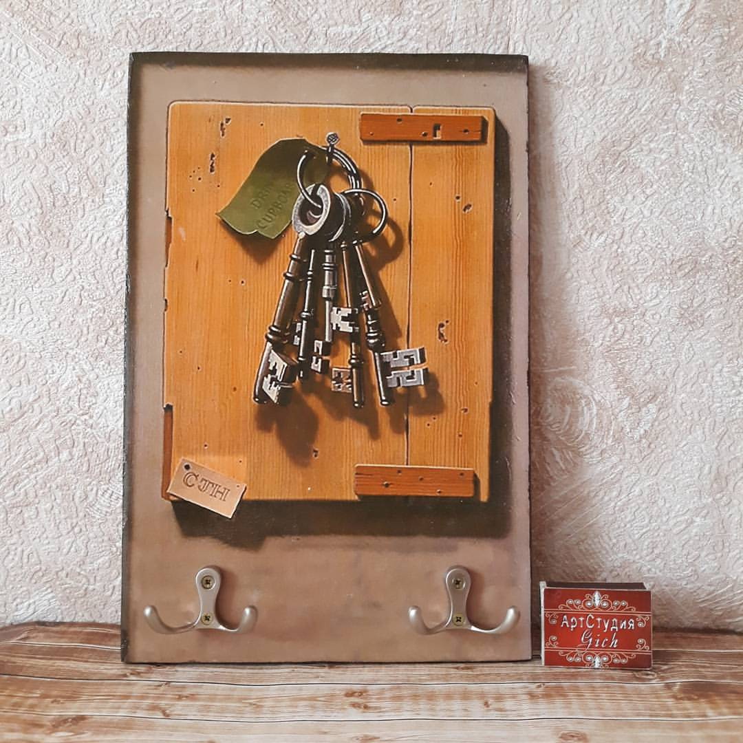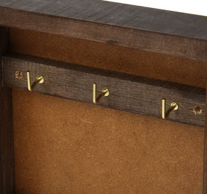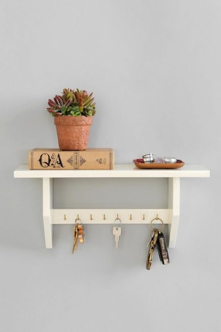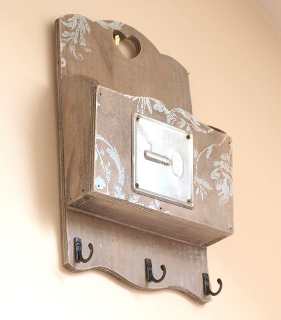 - na parte de trás da empregada com uma broca, faça furos para o gancho no qual ele irá travar, e na parte da frente - furos para ganchos nos quais as chaves irão se pendurar.