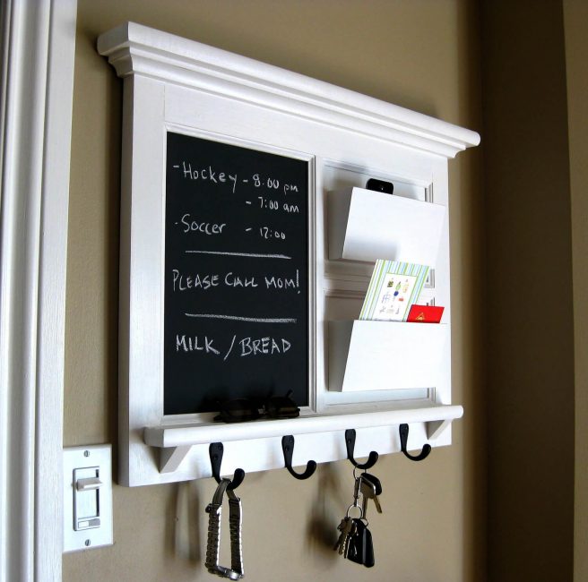 Gancho de chave de parede no corredor se encaixam perfeitamente - mais você não pode olhar para as chaves ao redor da casa. Essa é a principal vantagem de qualquer quadro-chave: economizar tempo. Por algumas semanas você desenvolverá um hábito à noite, quando chegar do trabalho, pendurar uma chave e, de manhã, quando for trabalhar, tire-a. Como resultado, você não precisa mais procurar o apartamento em busca de chaves perdidas, e você está sempre ciente de quais de seus parentes estão em casa - basta olhar para a governanta e ver se todas as chaves estão no lugar.