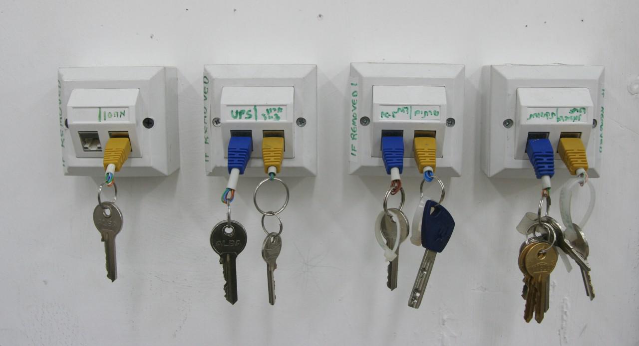 Tal ideia pode ser encontrada com frequência: uma empregada na forma de uma casa, separada em elementos sob a forma de figuras humanas. Cada chave está anexada. Quando uma pessoa quer pegá-la, ele tira a figura e a leva no bolso. Dos vazios restantes, você pode facilmente entender quem está em casa e quem não está.