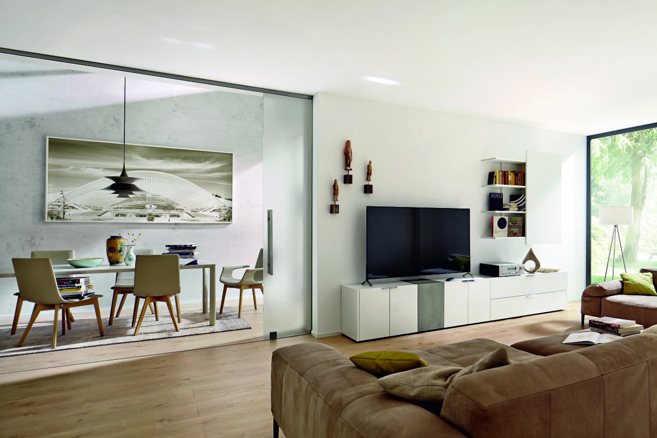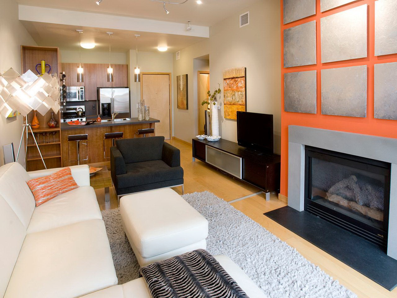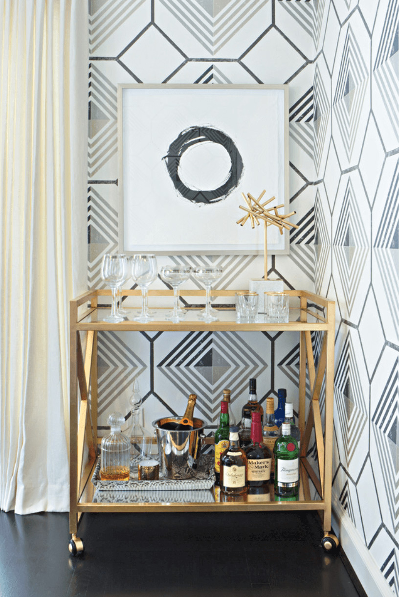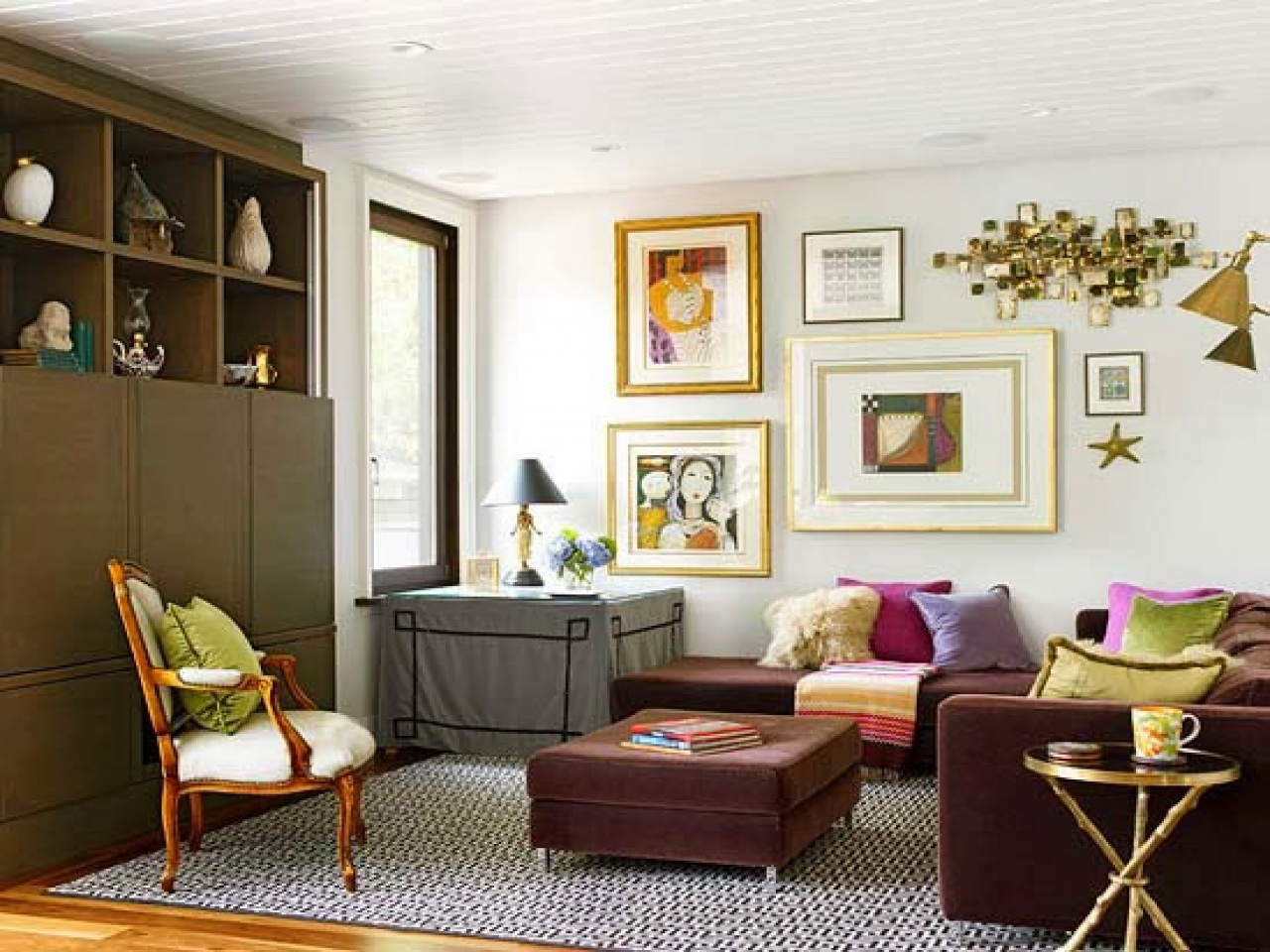 Consoles de mídia e racks de TV ficam sob a TV, e o aparador é geralmente colocado ao longo da parede mais longa. Prateleiras altas e armários abertos nos quais lembranças, livros, acessórios e fotos de família são armazenados ficam melhor em uma parede vazia maior para que não pareça lotada. Bar armários e carrinhos são elementos que adicionam uma aura de glamour à sala de estar.