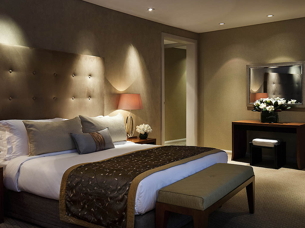 Cama: no quarto principal habitual, mais ou menos quadrado, deve haver espaço suficiente para uma cama queen-size ou king-size.