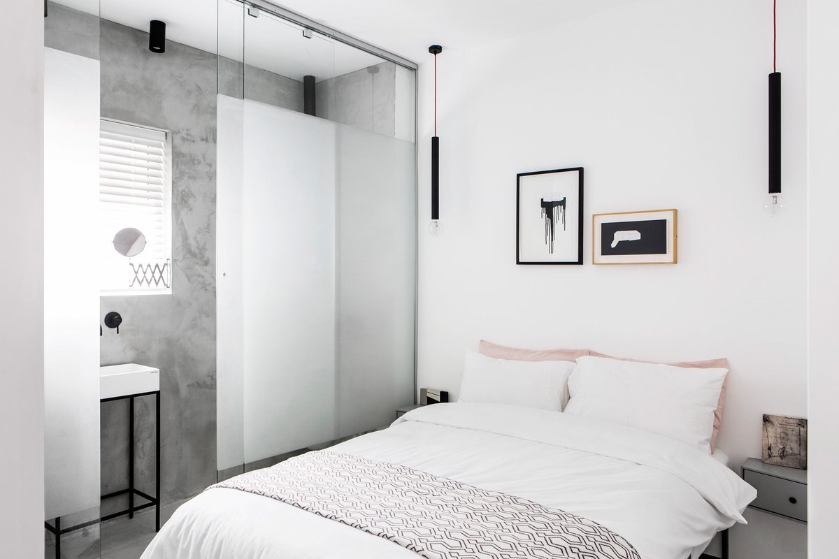 Layout: Se o seu quarto mal acomoda uma cama, existem alguns hacks que ajudarão você a gerenciar o espaço. Embora seja indesejável empurrar a cama contra a parede, tente deixar o menor espaço possível em um lado - isso vai deixar mais espaço na outra extremidade para uma mesa de cabeceira maior. Prateleira suspensa no lado oposto funciona muito bem em cantos problemáticos.