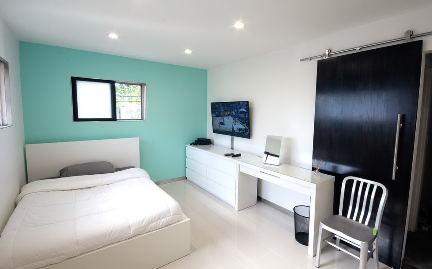 Cama: Escolha uma pequena cama de casal com armazenamento embutido em vez de uma cômoda.