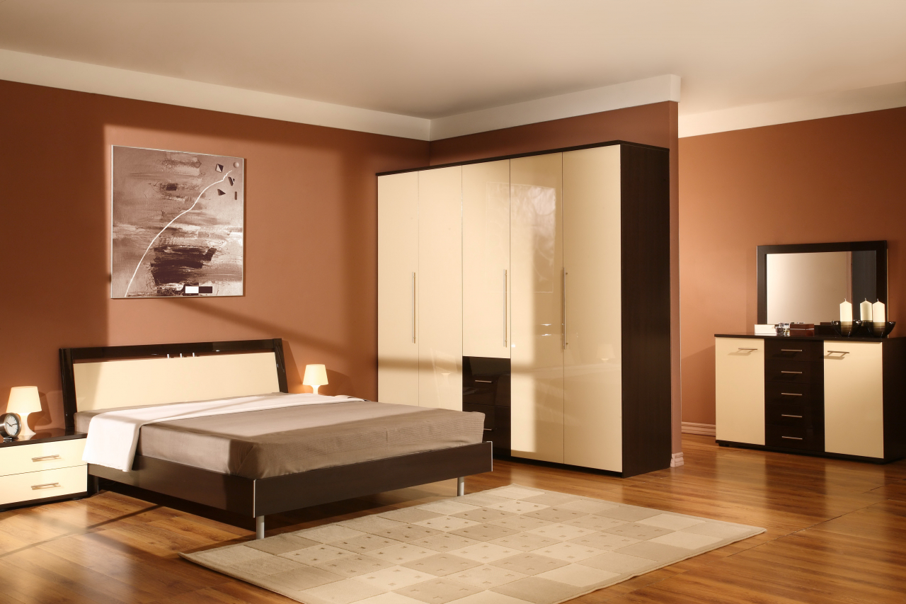 Layout: um tapete grande (20x30 cm ou mais) ajudará a proteger o espaço. Escolha mesas de cabeceira e candeeiros adequados que captem a maior parte da parede e uma cómoda com uma poltrona na parede oposta. Este é um design de quarto clássico e robusto que funciona sem problemas.