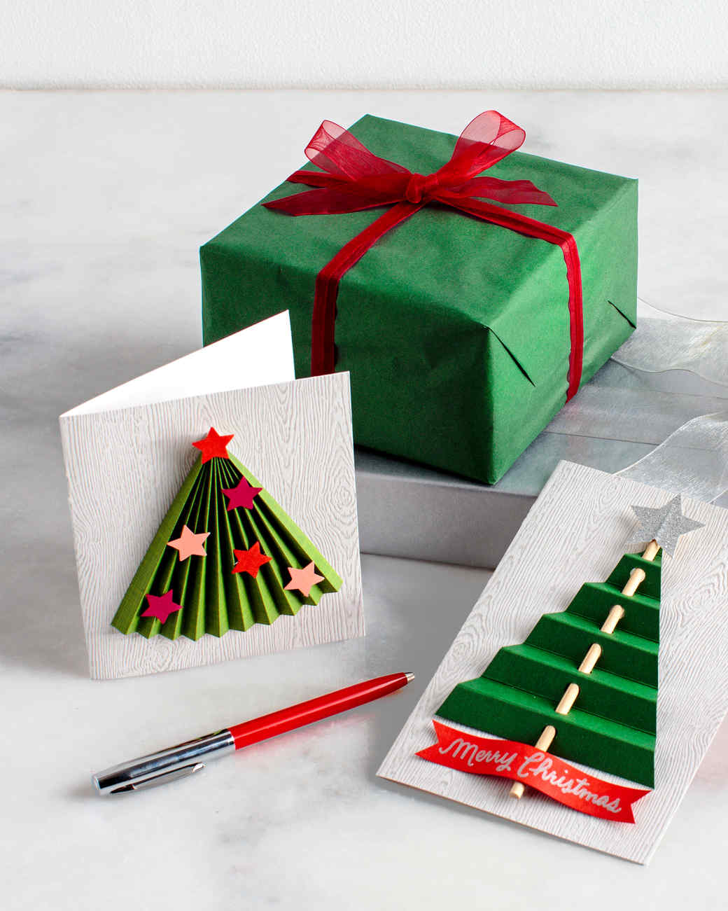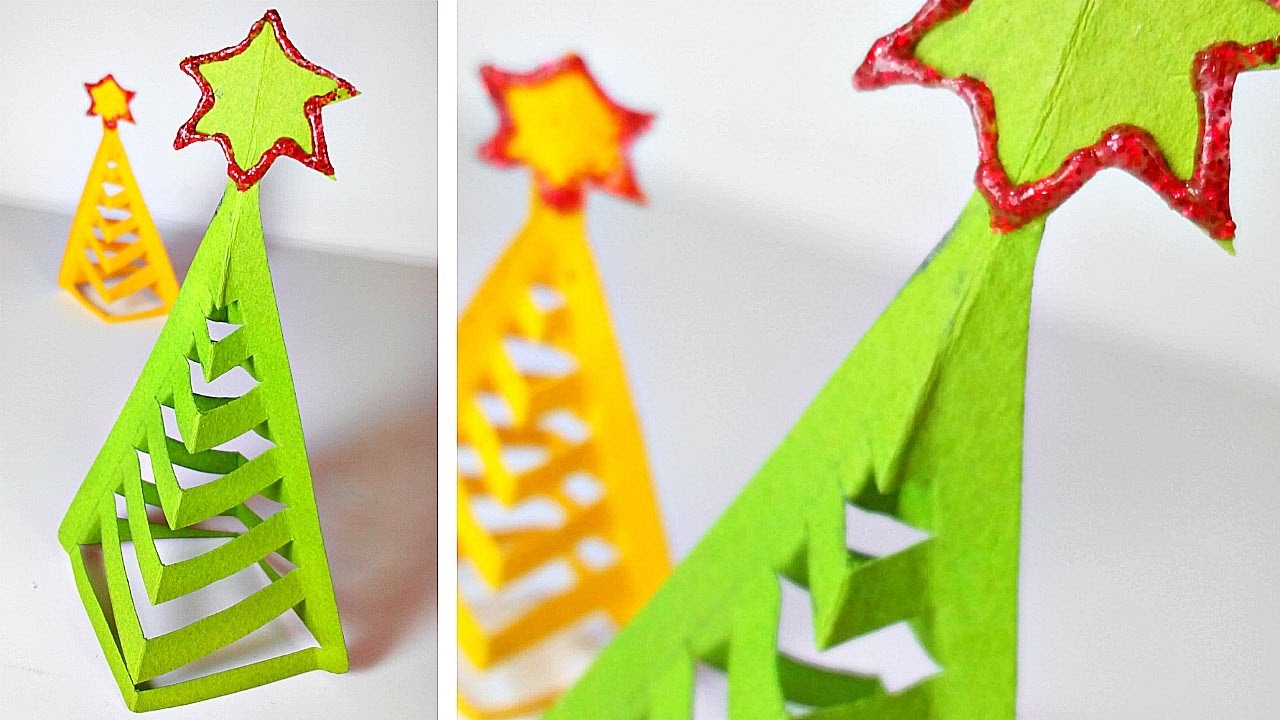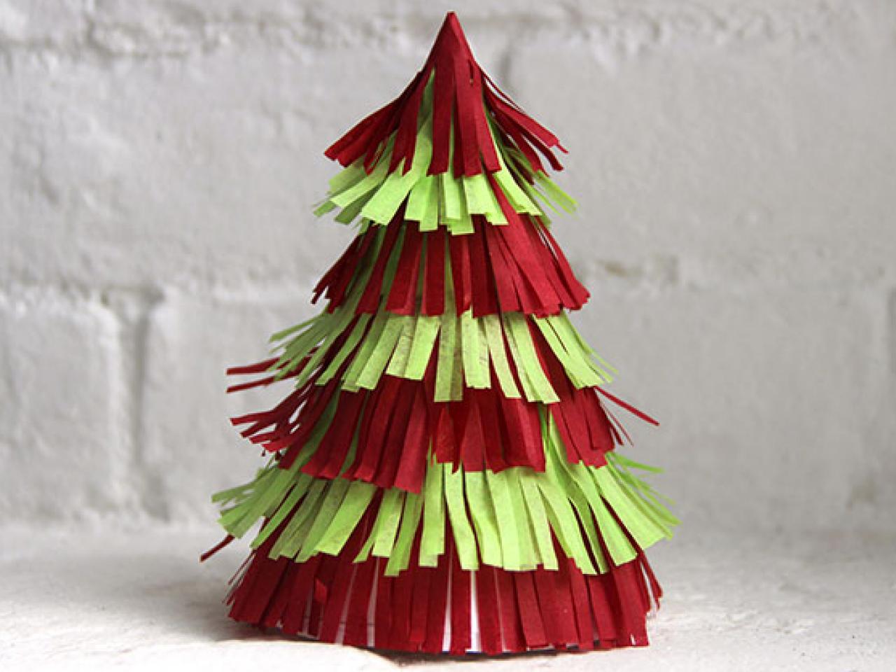 Faça um quadrado de papel verde colorido e dobre-o em um triângulo. No lado comprido da figura, desenhamos uma tira recuando 1 cm e desenhamos linhas perpendiculares da primeira tira a uma distância de 1 cm uma da outra. Cortamos cada linha, desdobramos o espaço em branco e colamos as tiras de volume no meio, fixamos uma estrela de papel vermelha no topo.