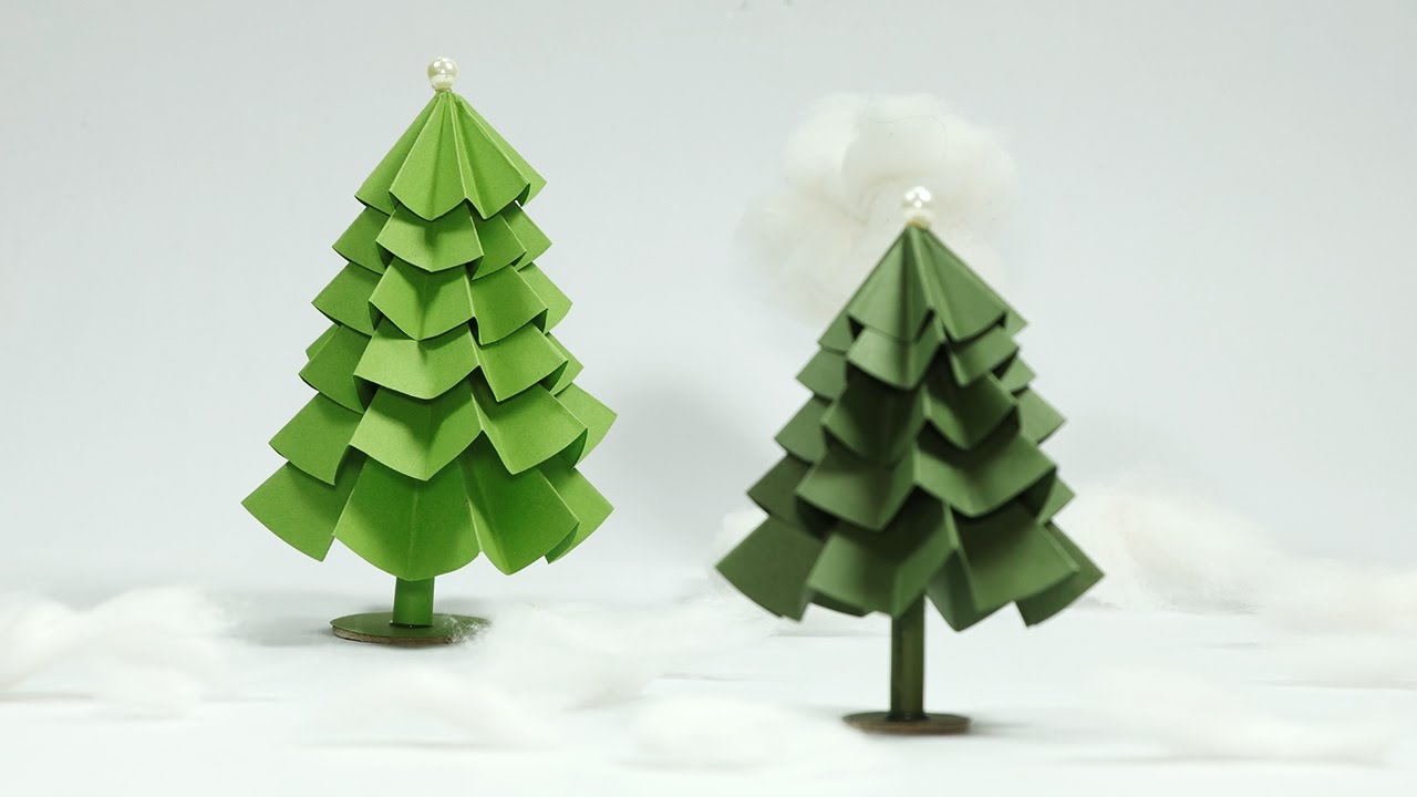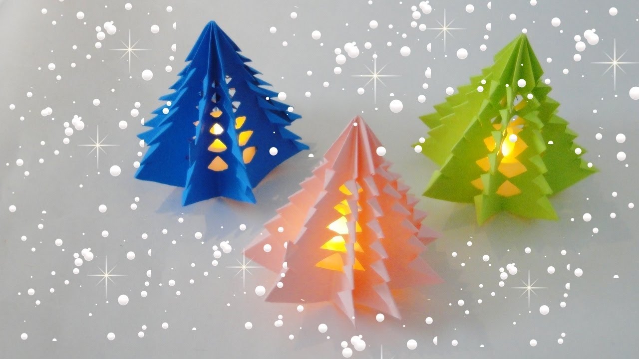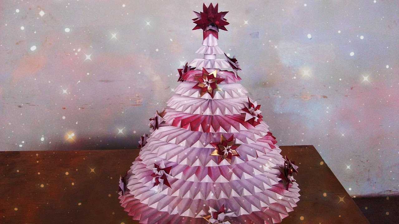 O papel deve ser dobrado diagonalmente 3 vezes, após o que desenhe as tiras e corte-as antes de chegar ao centro do espaço em branco. Os cortes precisam alternar: 1 vez para fazer uma incisão à esquerda, a segunda à direita e assim por diante. Abra o papel dobrado e endireite a árvore nas dobras.