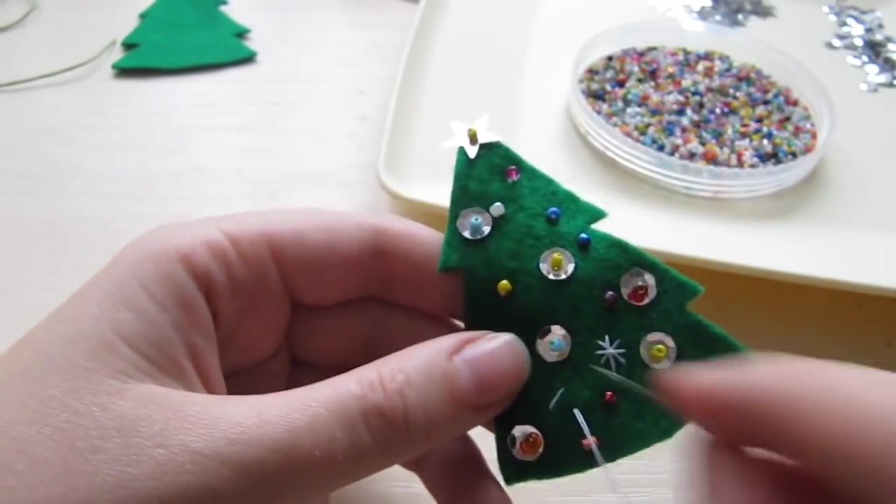 Tomamos a parte da frente, numa ordem caótica costurar lantejoulas: colocamos a decoração no feltro, depois enfiamos as contas e costuramos. Então continuamos até que o espaço em branco esteja cheio de decoração. Costuramos uma lantejoula em forma de estrela no topo.
