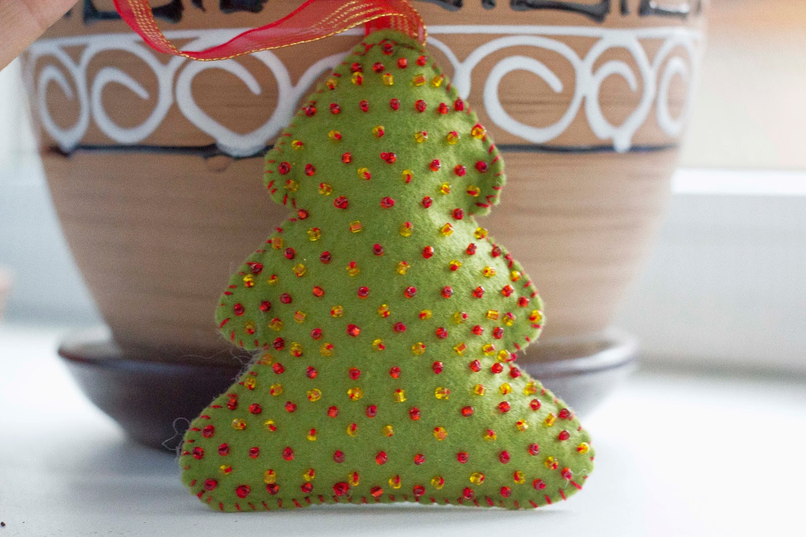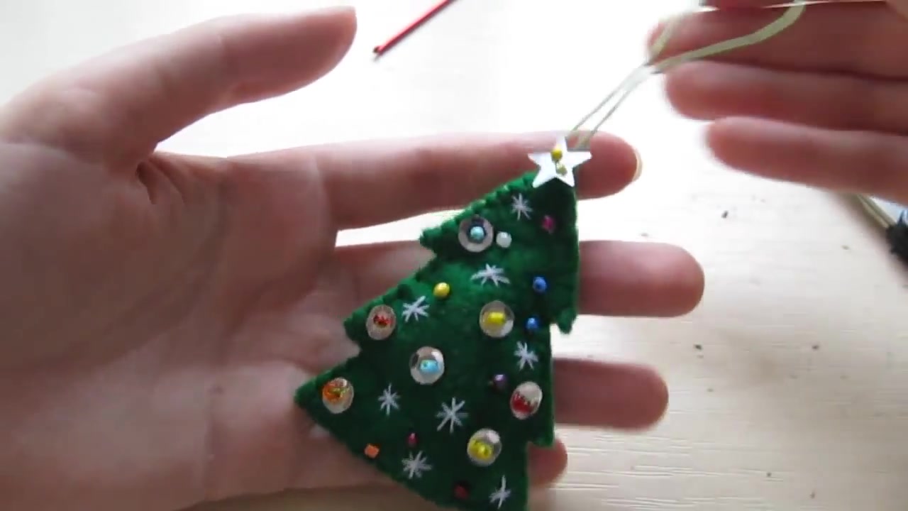 Se desejar, você pode opcionalmente bordar flocos de neve com fios leves; Em seguida, prossiga para costurar os espaços em branco, começando pelo topo. No final, deixe um pequeno buraco para o algodão, coloque-o dentro com um gancho. Inserimos um cordão encerado, finalmente o fixamos com um fio - o nosso brinquedo de feltro está pronto!