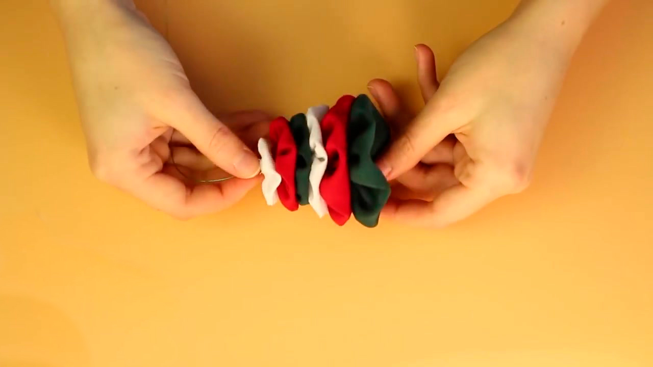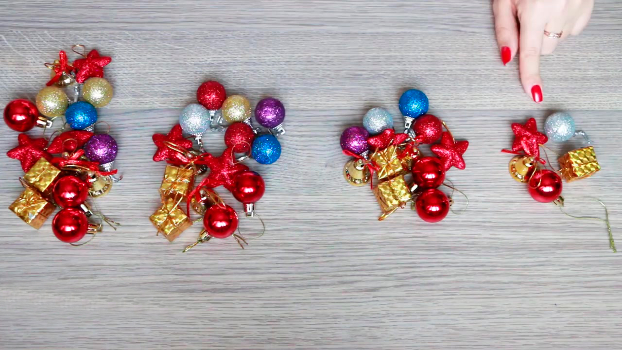 Dividimos os brinquedos preparados em 5 partes, ou seja, deve haver 5 grupos de brinquedos, em cada um dos quais existem 5 produtos. Pegamos o fio verde, cortamos 5 pedaços pequenos de cerca de 30 cm, amarramos cada grupo de brinquedos neles separadamente.