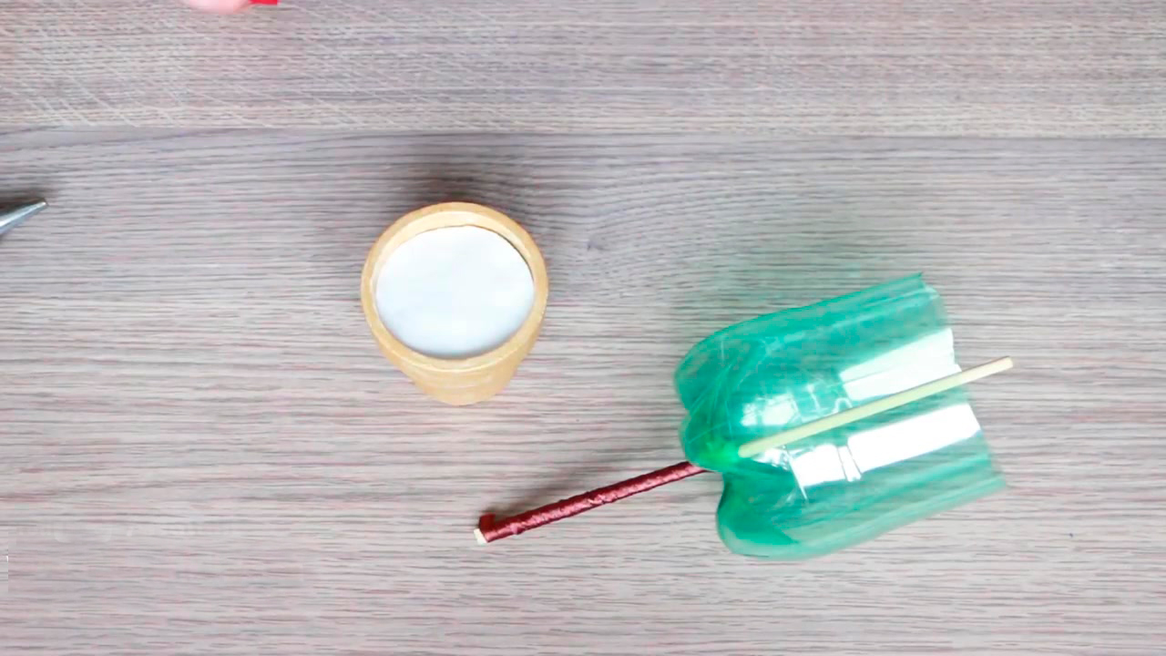 Nós decoramos metade da varinha com fita. Na panela, despeje alabastro diluído com água, coloque o palito com a garrafa incisa. Estamos esperando o gesso agarrar e endurecer.