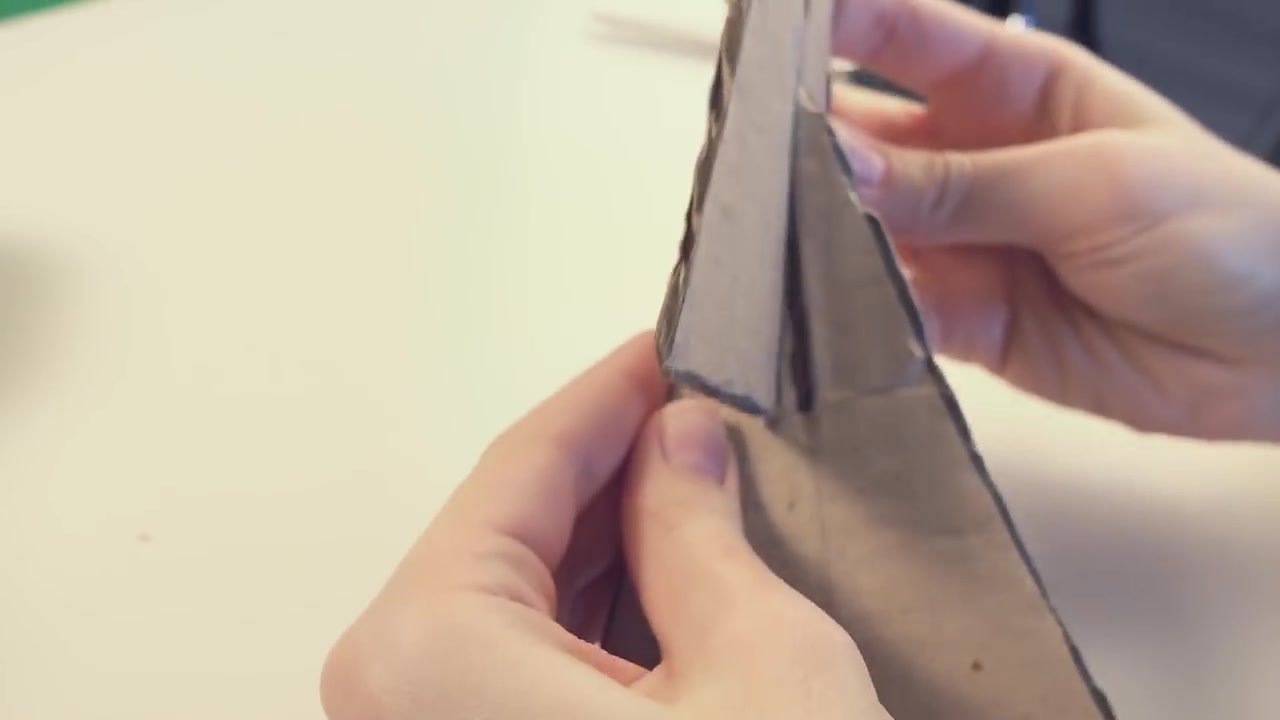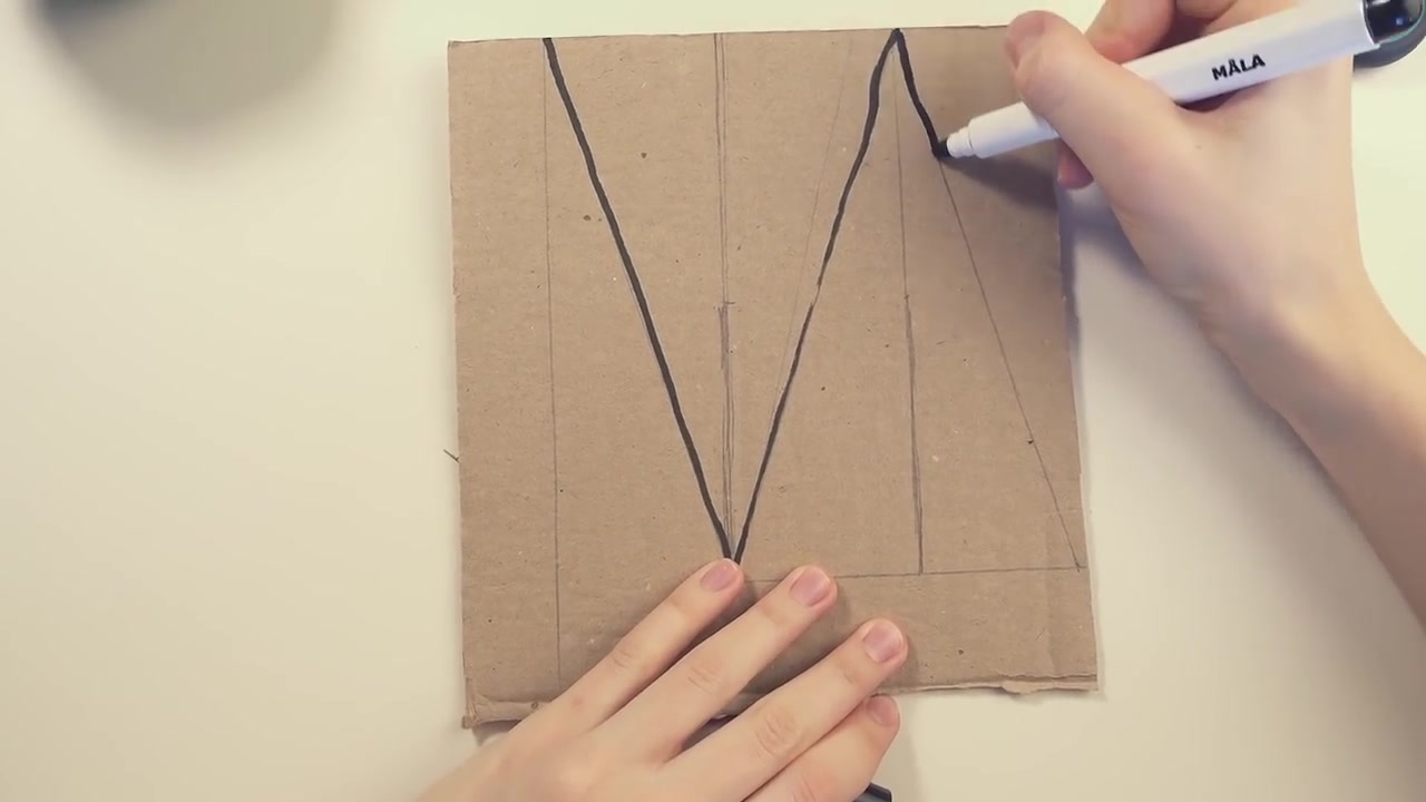 - Em um papelão grosso, desenhe a peça de trabalho. O tamanho dependerá das suas preferências. Recomendo que a altura do produto fique em torno de 20 cm O branco é um triângulo isósceles, desenhado com uma régua em duas cópias.