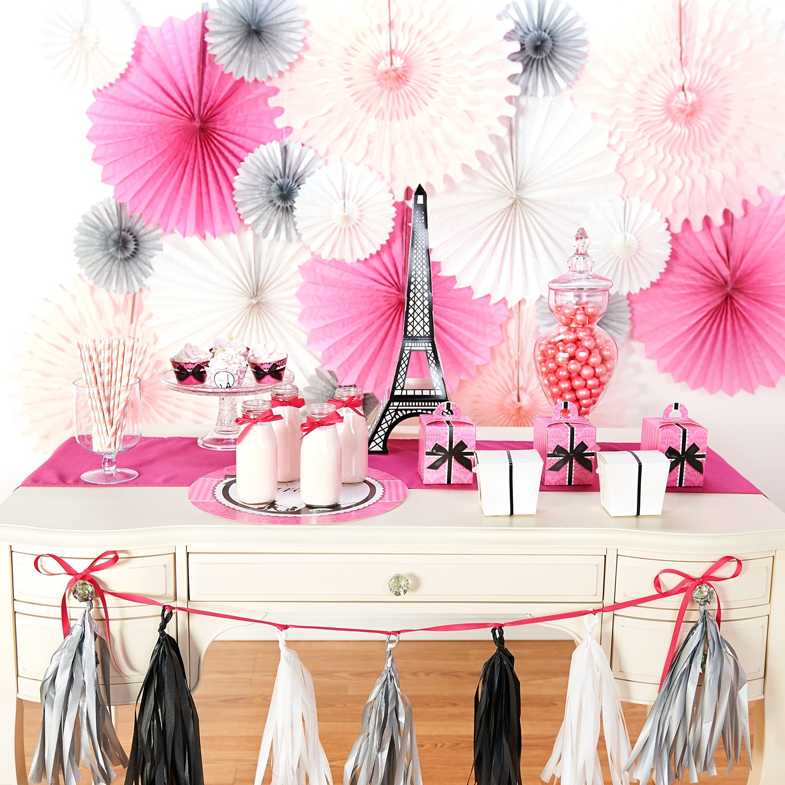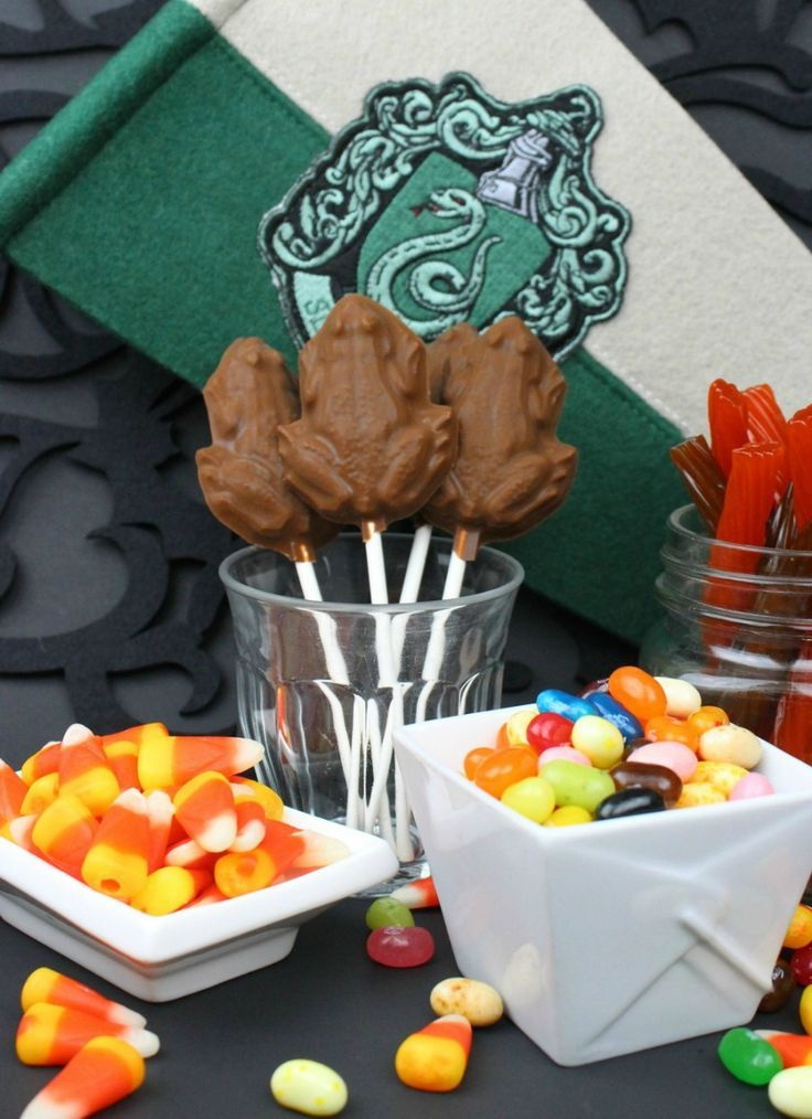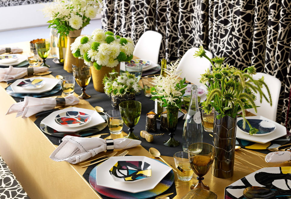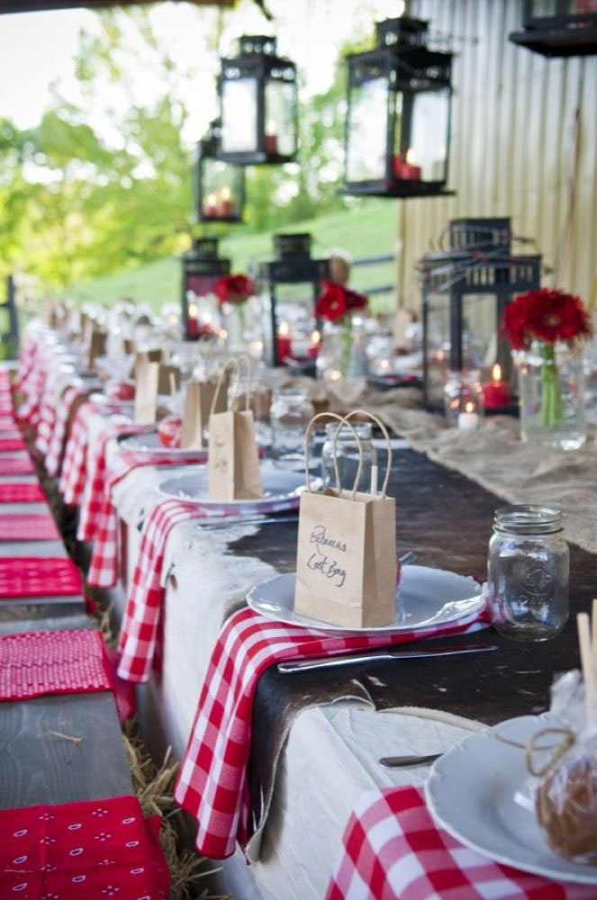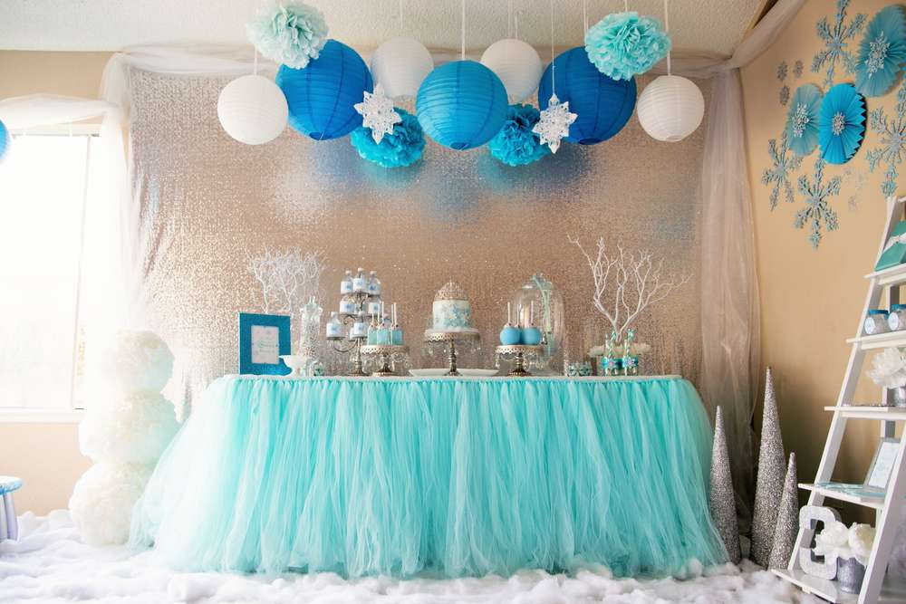 Acima da mesa, estique as luzes do teto, bolas de gel no teto. Você pode amarrar doces leves nas cordas, decorações que pairarão sobre a mesa. Tente resistir ao esquema de cores da mesa de acordo com o tema do feriado. Para fazer isso, há uma enorme seleção de pratos de papel, copos, copos de vinho e tubos para coquetéis.