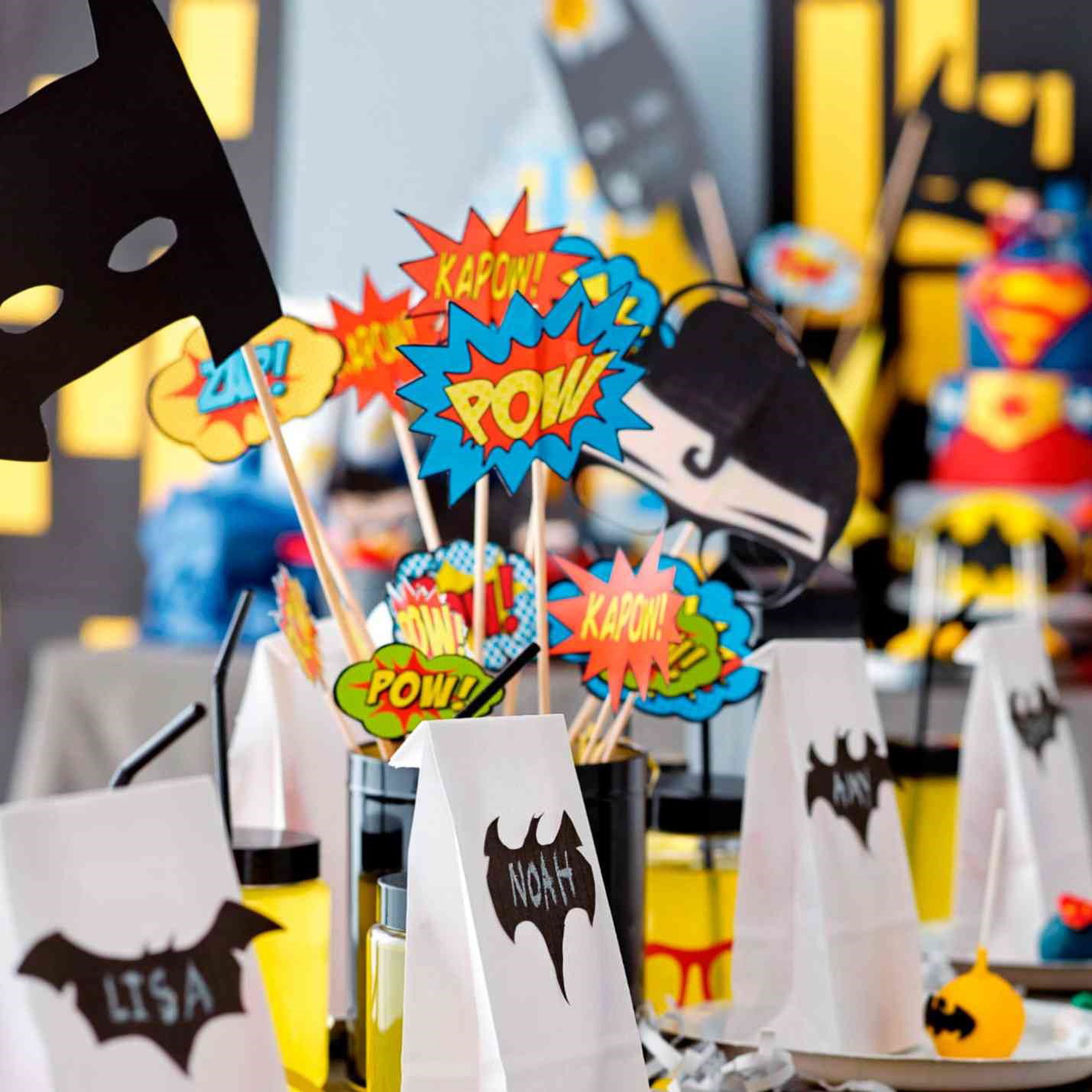 - Pratos brilhantes e tubos para coquetéis na mesa, guardanapos com desenhos animados.