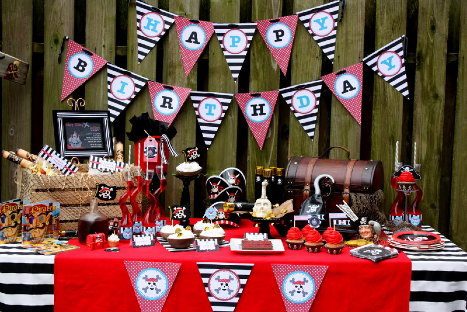 Os piratas são amados por meninos e meninas, e muitas pessoas querem experimentar o traje de Jack Sparrow. Para a celebração no estilo pirata, há muitos cenários, e decorar a sala neste tópico não é difícil.