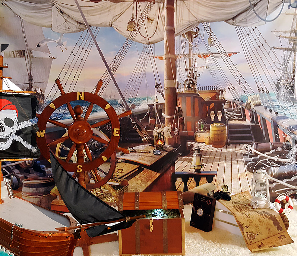 Uma luz abafada, paredes envoltas em tecido azul e uma área de sessão na forma de uma cabine com janelas redondas ajudarão a criar a atmosfera certa. Com a ajuda de um volante leve e cortinas na forma de velas, você projeta a ponte do capitão. As crianças terão prazer em participar da criação de todo o navio de cadeiras e outros materiais disponíveis.