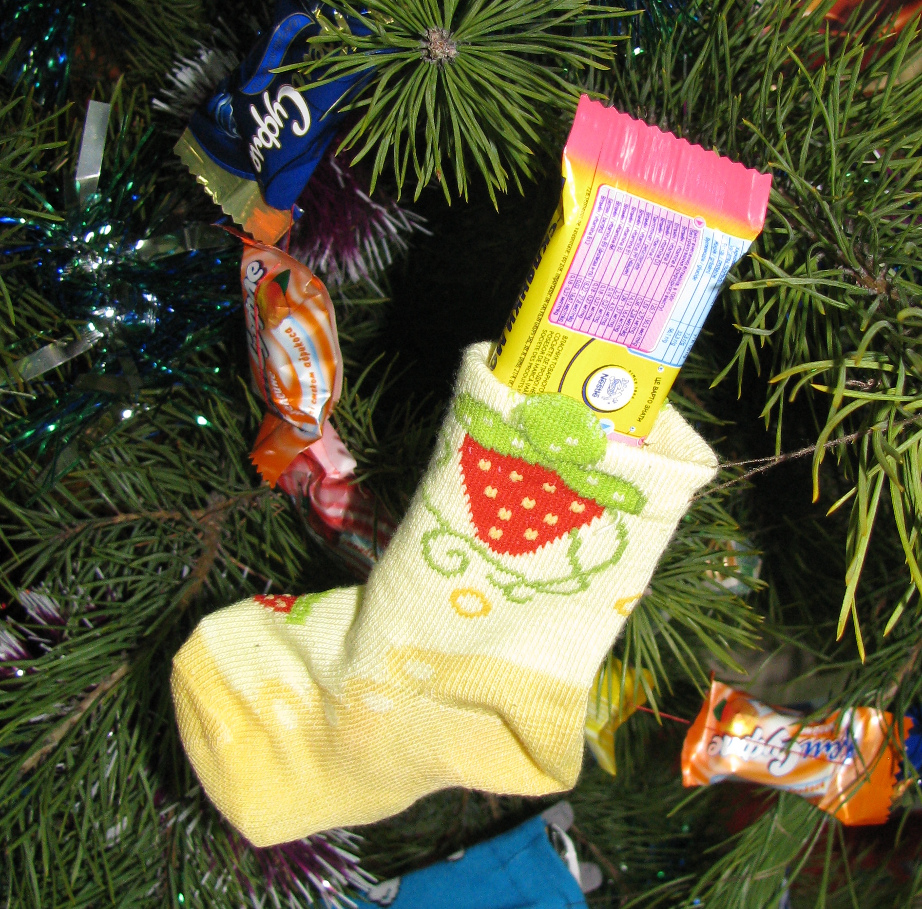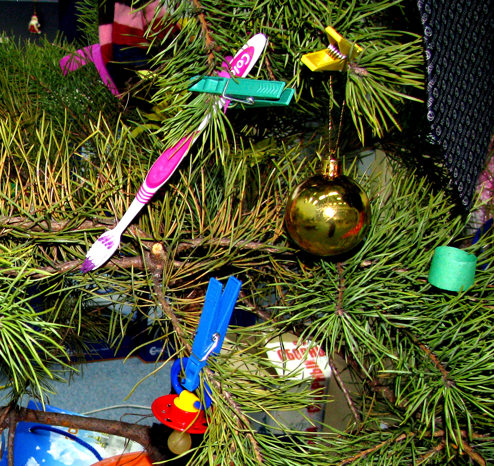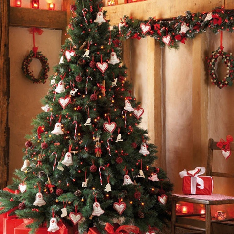 Aqui para a imaginação dos membros de toda a família não há limites. Todas as decorações podem ser penduradas em uma árvore de abetos de forma caótica. A única regra que deve ser seguida é evitar o acúmulo dos mesmos brinquedos em um só lugar. Os produtos mais espetaculares devem ser colocados em primeiro plano. Garland é usado no mesmo princípio, não deve haver assentos vazios, mesmo da parte invisível.