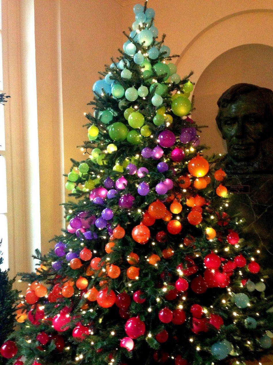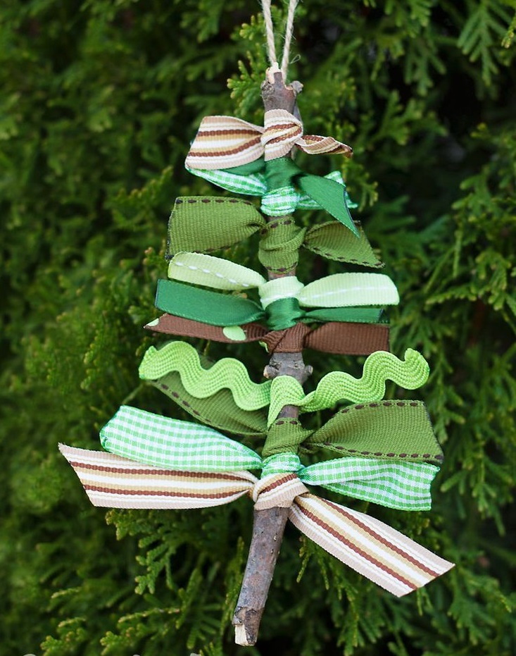 Neste caso, todos os acessórios são pendurados com pequenos recuos e ao lado. Os bulbos também devem estar localizados no pinhão em toda a sua altura. Para tornar este parafuso mais perceptível, você pode usar seus próprios tipos e cores de brinquedos para cada faixa.