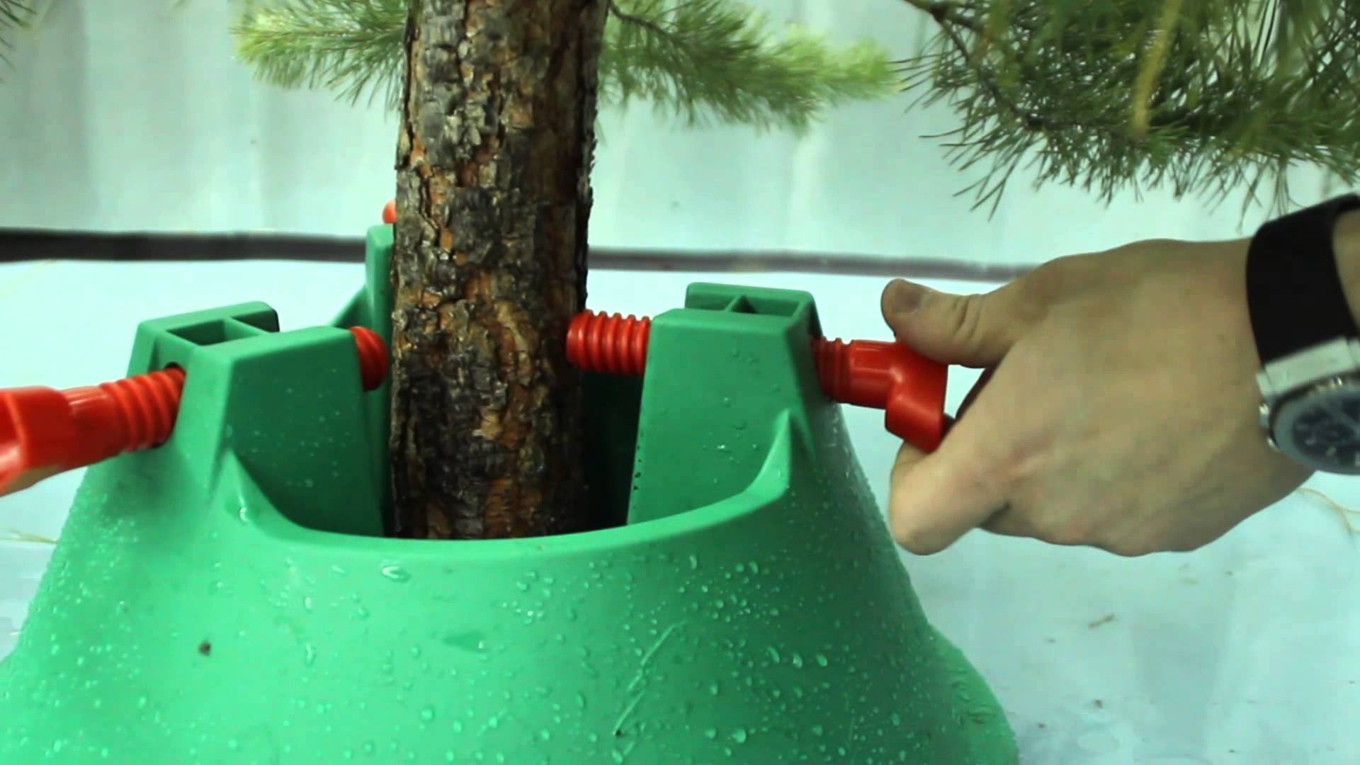 Que o pinheiro permaneceu firmemente, especialmente se tiver dimensões impressionantes, é necessário cuidar da compra de uma cruz maciça. Dispositivo popular na forma de um balde de areia é apropriado para usar apenas para árvores de tamanho médio.