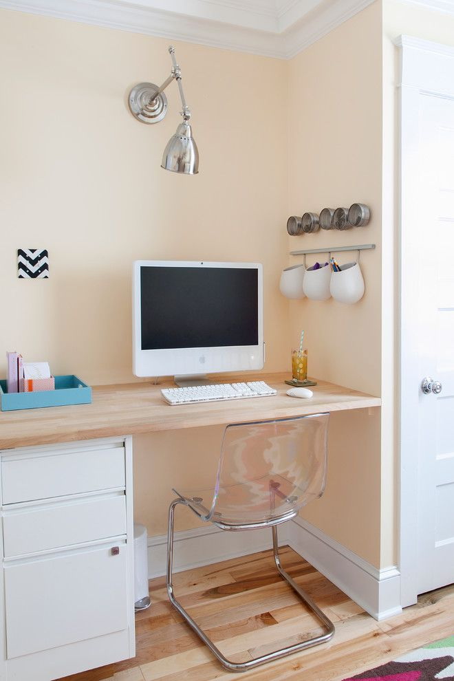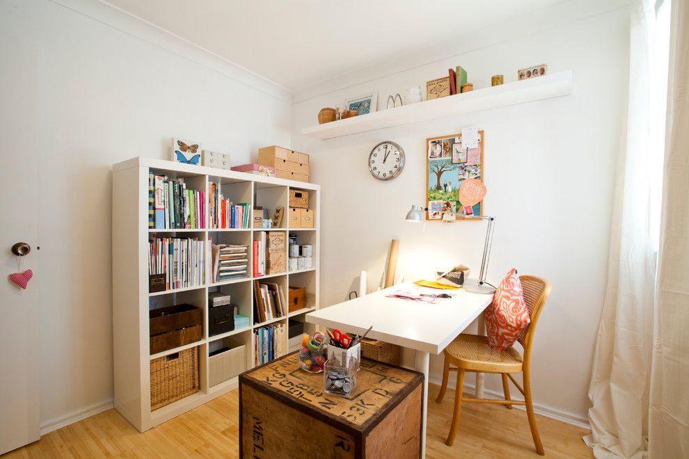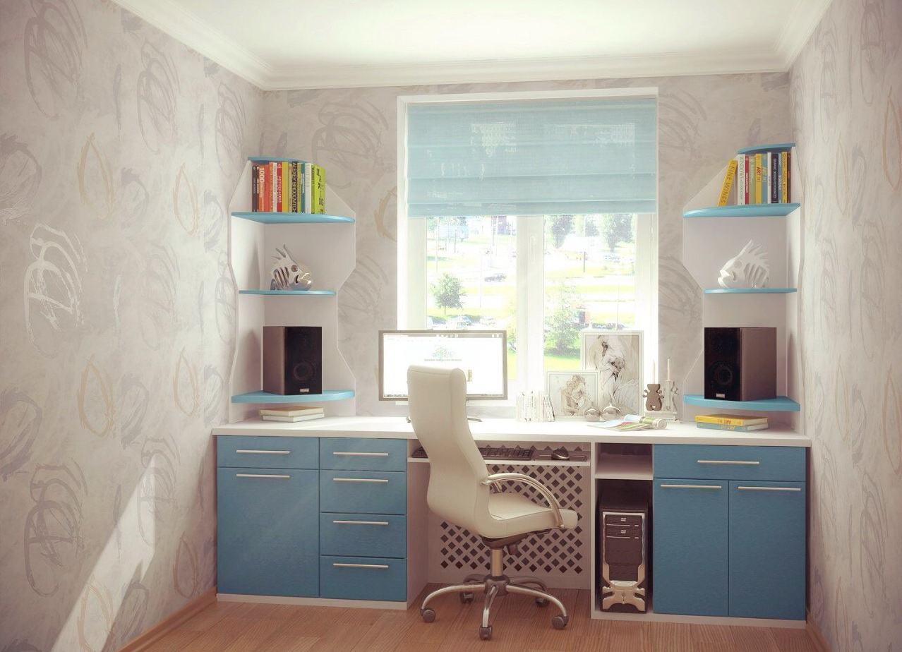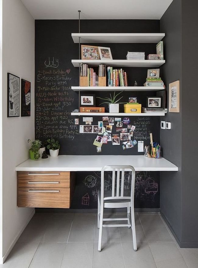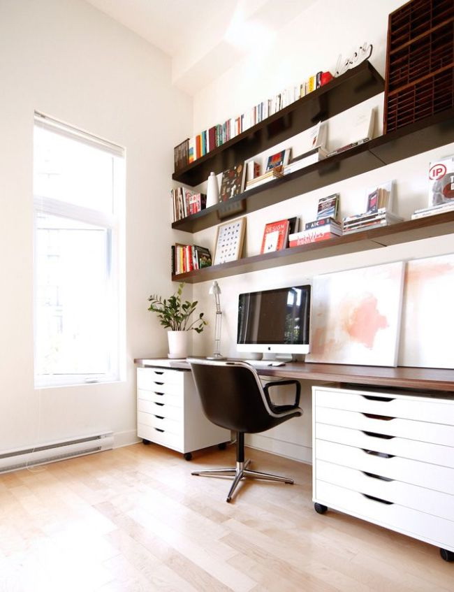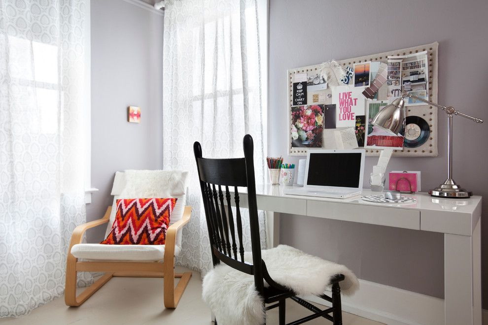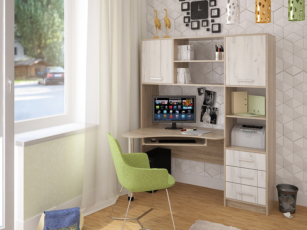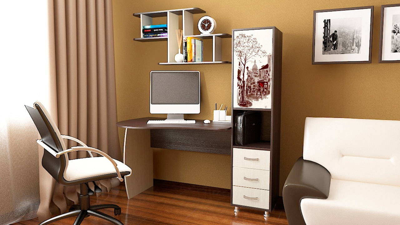 Opção para escritório ou escritório no apartamento, que também é adequado para o quarto do aluno e do aluno. A visão do computador não é adequada para nenhum estilo de interior, mas é a mais versátil em um apartamento moderno da cidade.