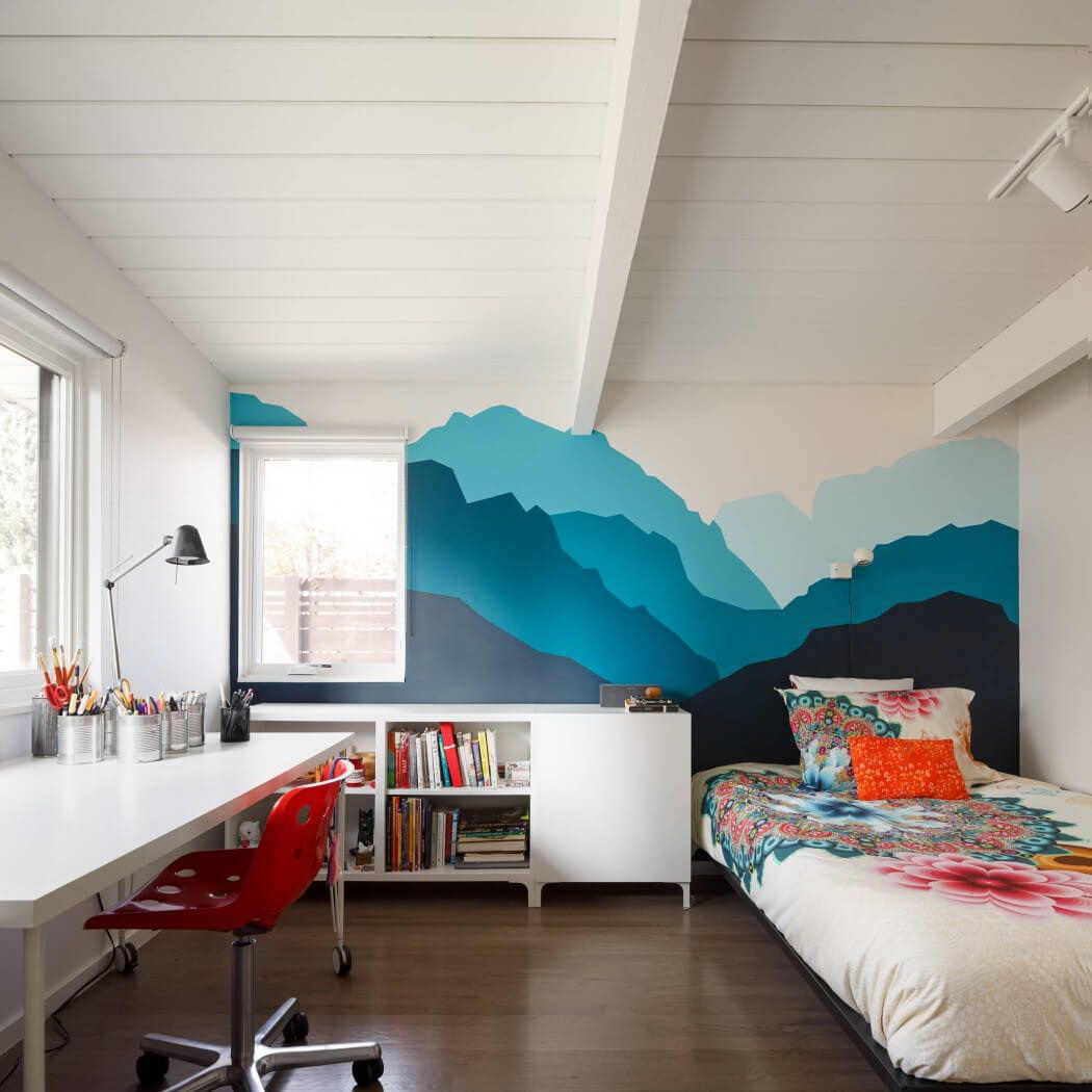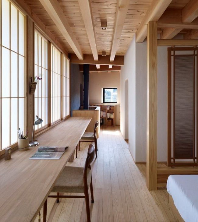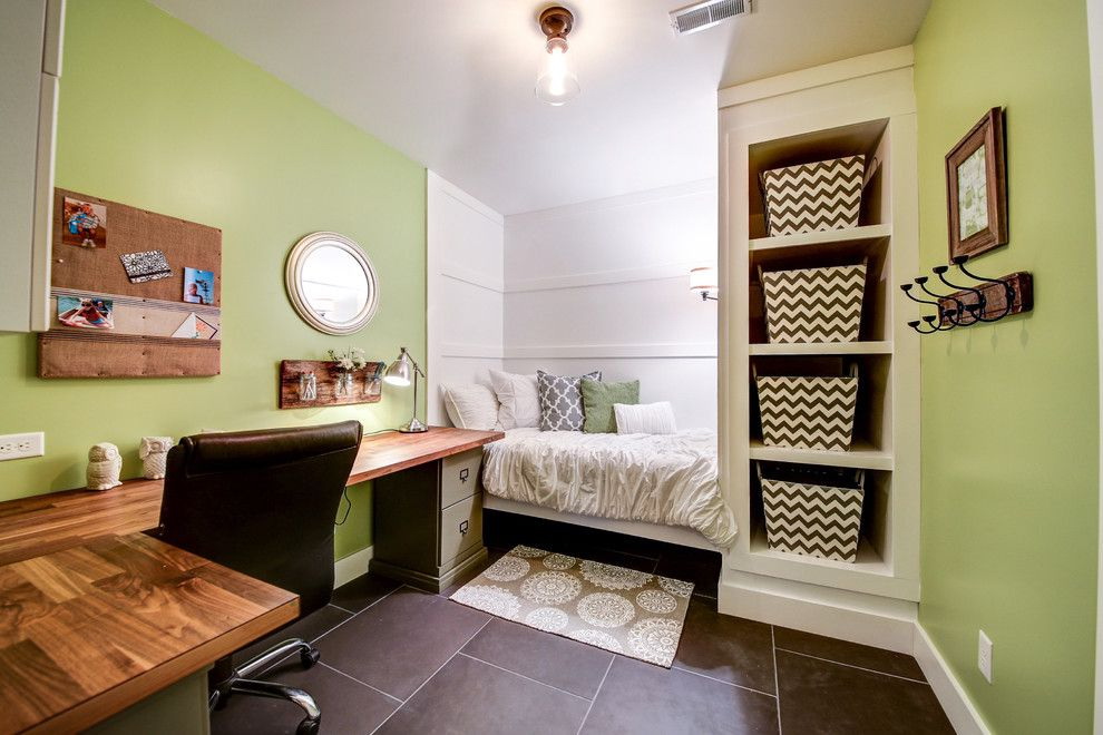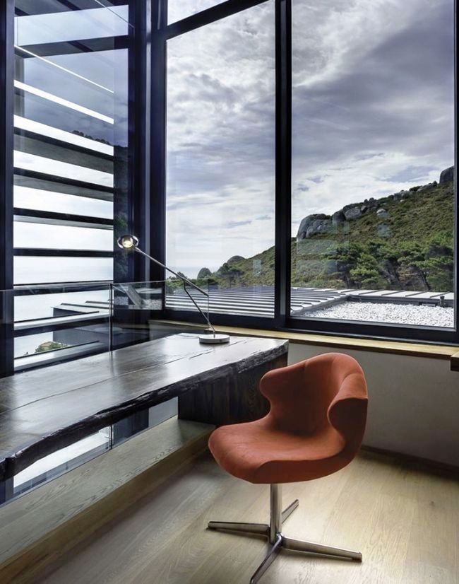 Conveniência é a principal condição aqui, assim você pode encontrar nichos confortáveis, furos de arame, candeeiros de mesa embutidos e outras coisas úteis no design.