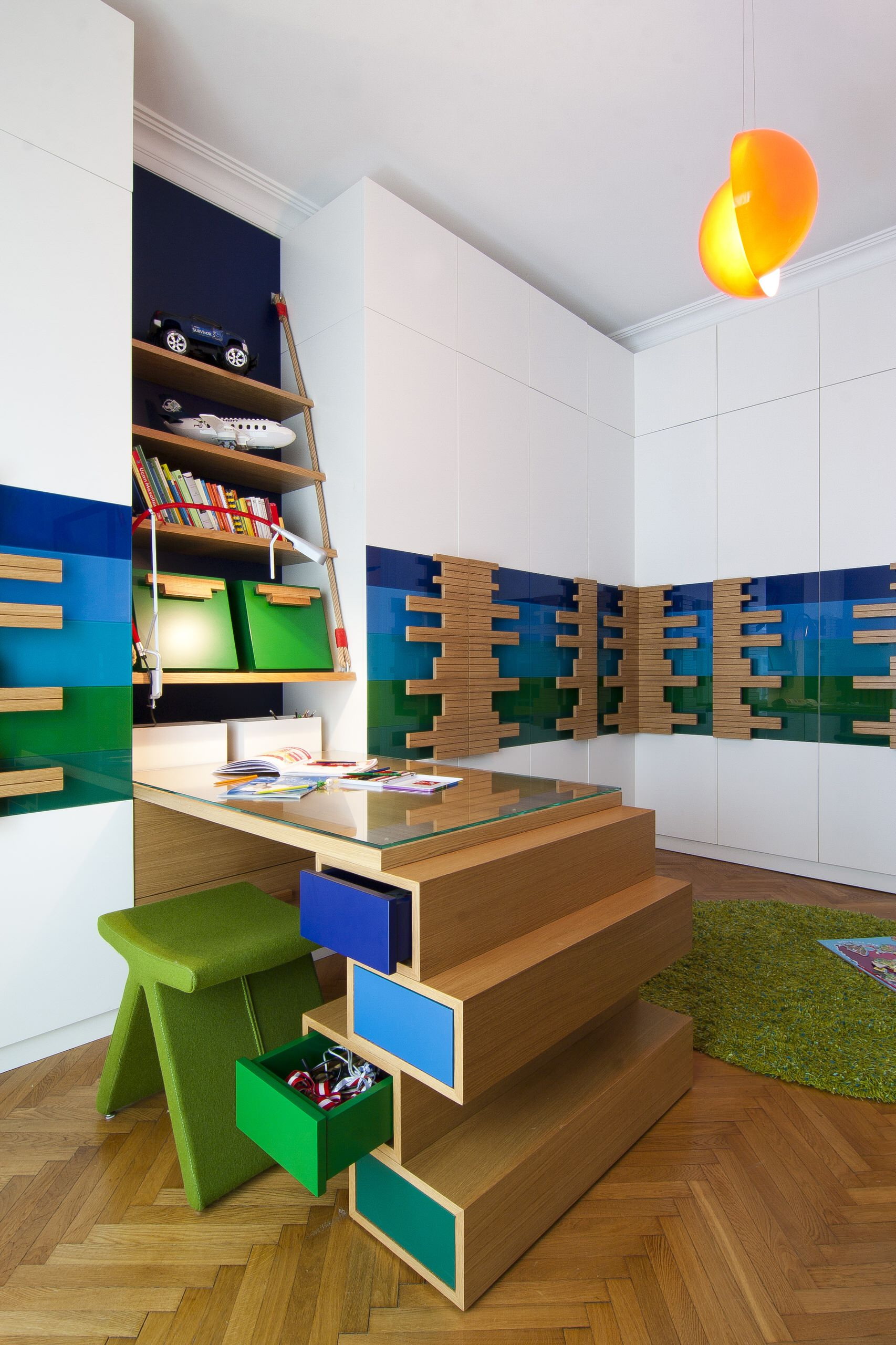 - É melhor que a mesa seja complementada com prateleiras e nichos de cima para que o bebê possa chegar calmamente ao necessário, mas a presença de gavetas do fundo também é importante porque grandes álbuns, livros didáticos e materiais educativos serão armazenados em folhas.