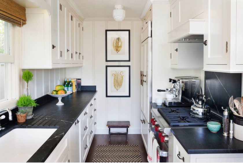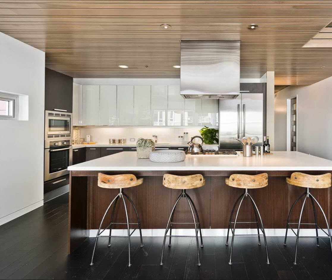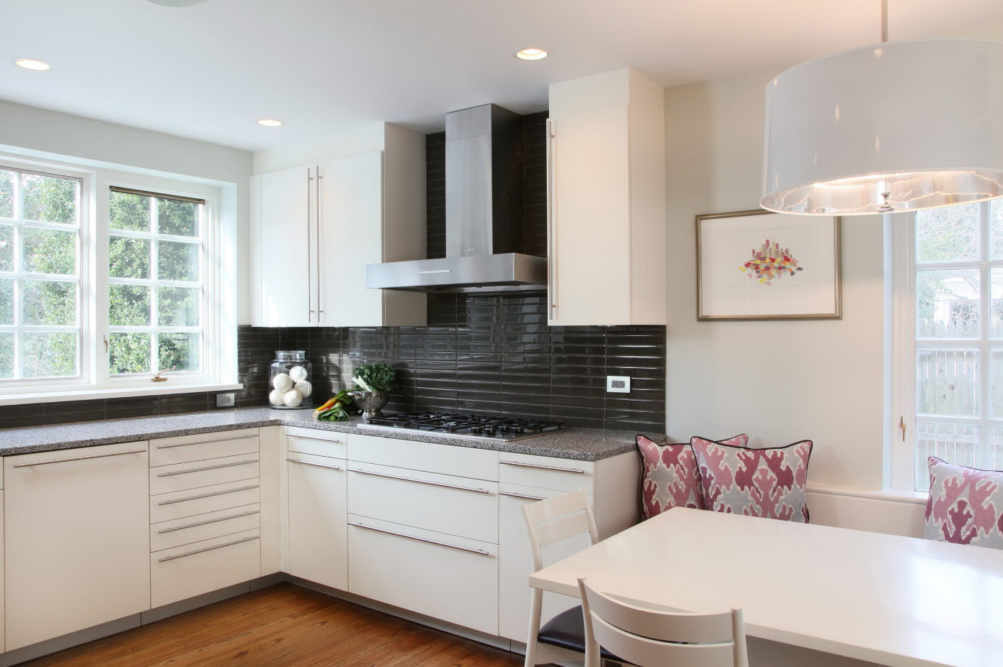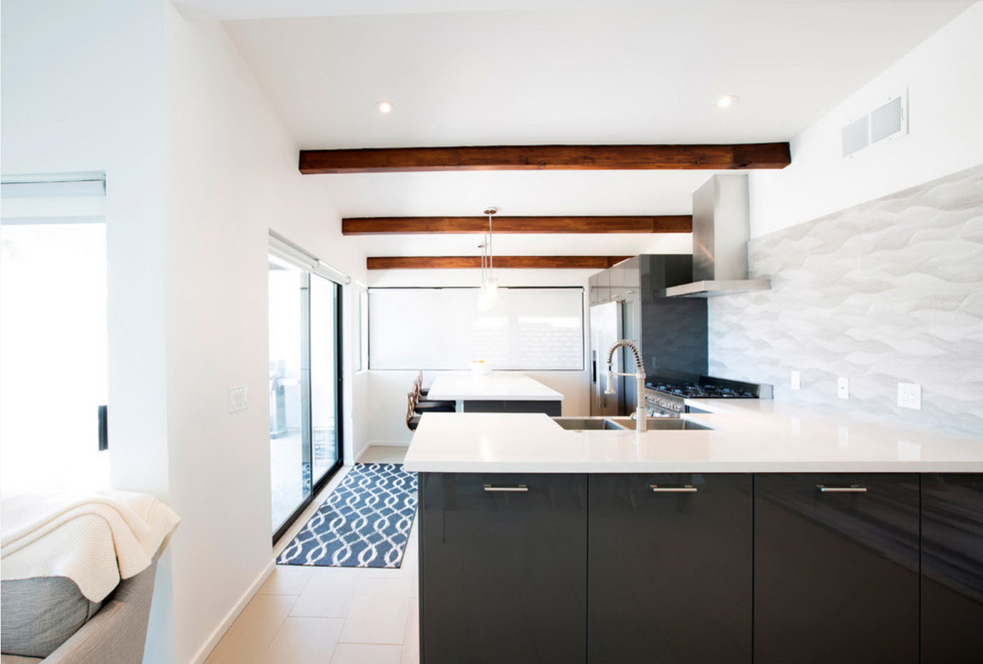 Moderno. Na direção moderna do design, será interessante usar a composição de pretoparedes brancas no estilo dos anos vinte do século XX. Por exemplo, estes poderiam ser marcos de arquitetura americanos bem conhecidos, que deveriam ser pendurados perto da área de jantar. Este canto será um verdadeiro destaque da cozinha.
