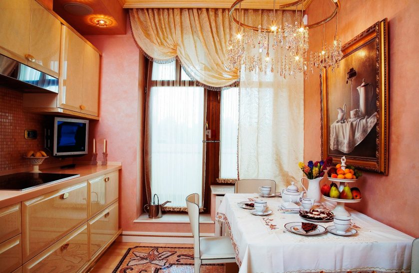 - Gama de cores. A cor das pinturas na sua cozinha deve corresponder ao tom das paredes, de móveis, itens de decoração e até mesmo o seu avental. Em uma sala neutra você pode se concentrar em cortinas, vasos e pinturas. Por exemplo brancos paredes e castanho o mobiliário complementará com sucesso as naturezas-mortas com saturado amarelotons de rosa, verde claro e cortinas em tom.