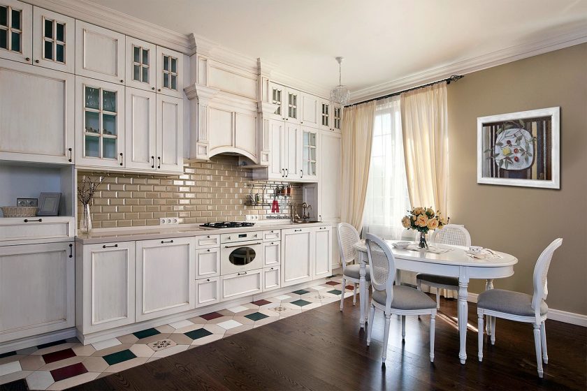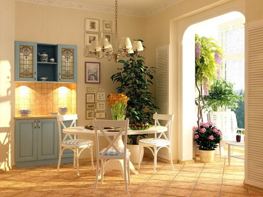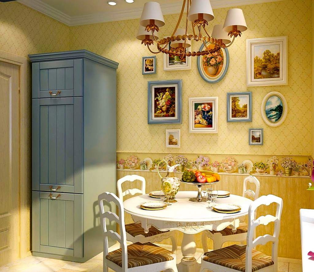 Rústico. Isso inclui o famoso provençaque transmite a atmosfera do interior da França, o fluxo de jardins floridos e o mar Mediterrâneo. A cor do interior é sublinhada por pinturas sem brilho e ligeiramente desbotadas, que devem representar a natureza ou os ornamentos florais.. Mobiliário de cozinha simples em estilo provençal também deve ser refletido em baguetes.. É desejável fazer ou comprar quadros de madeira natural não pintada.