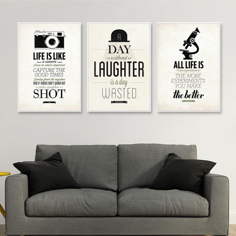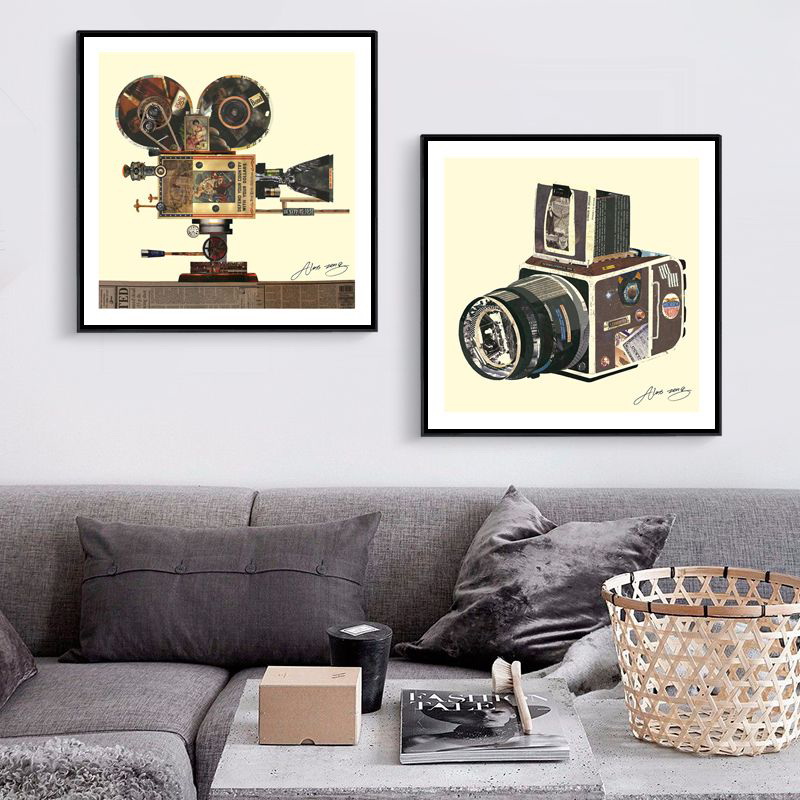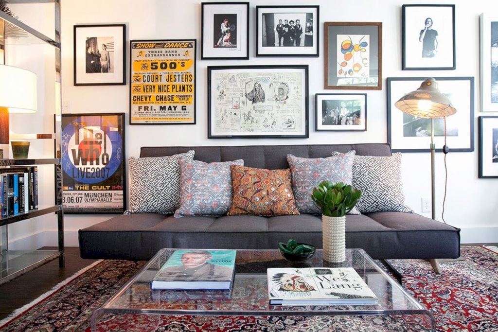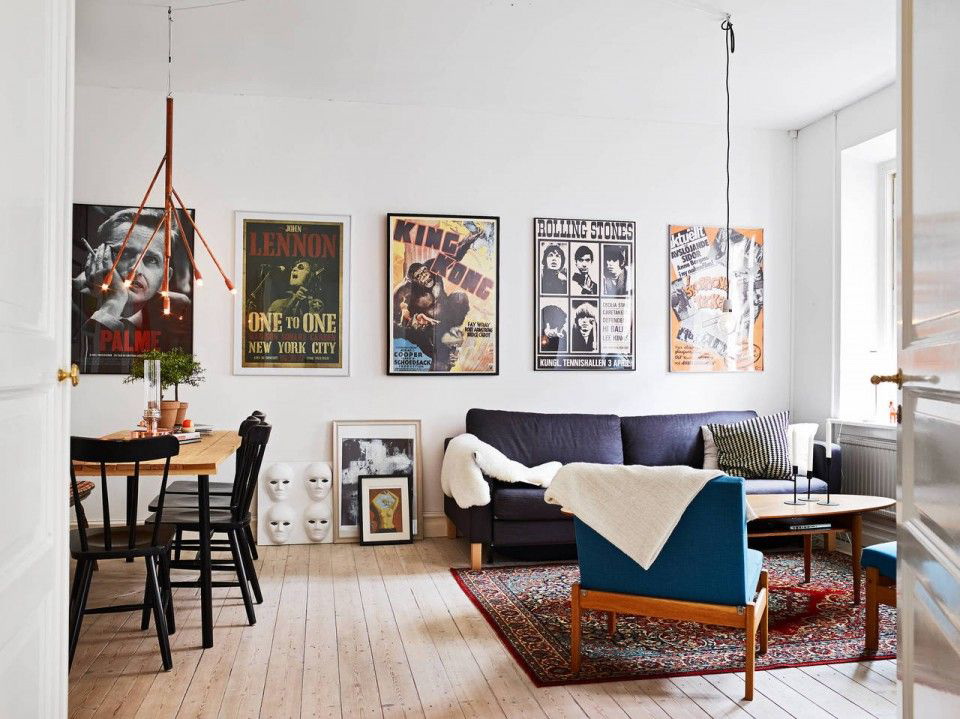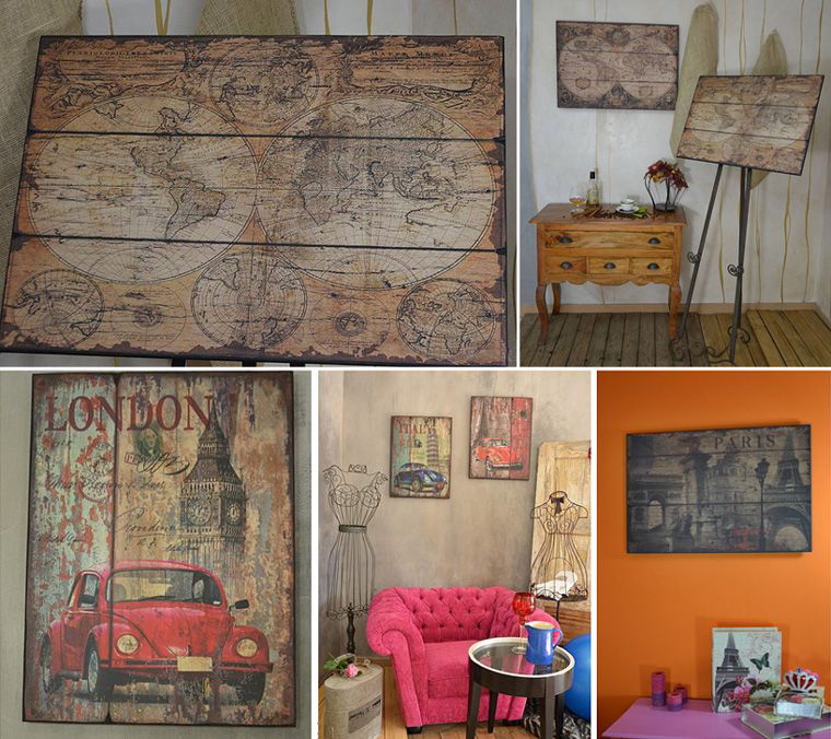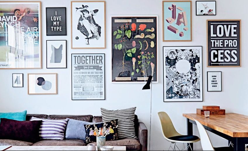- Combinação harmoniosa de pinturas de diferentes formas e direções, como cartazes e naturezas-mortas.