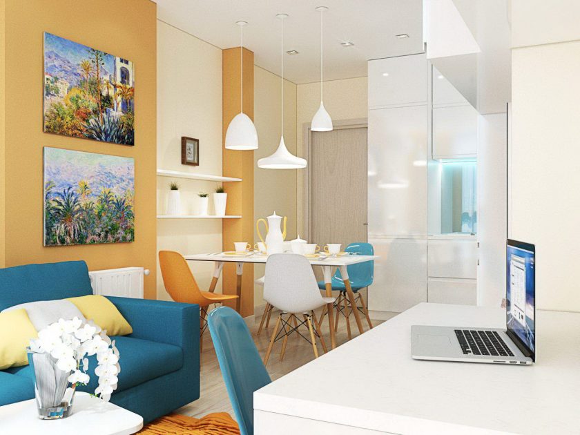 A cor para o seu caso deve ser baseada no design da sala, você também pode tentar jogar com contrastes. Não escolha opções muito escuras se o espaço for pequeno.. Isso criará um efeito de "buraco negro" e deprimirá o ambiente. Cores claras e ensolaradas, pelo contrário, expandirão o espaço.