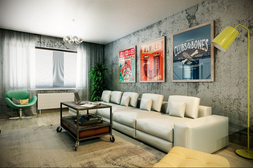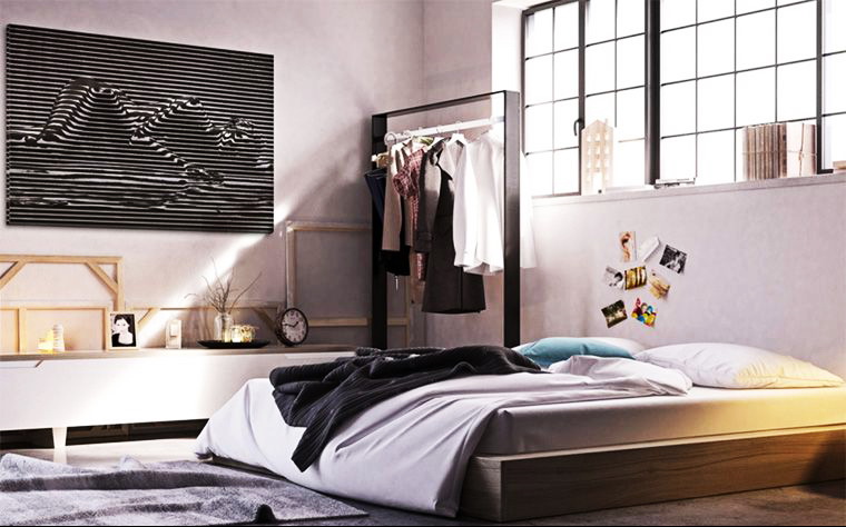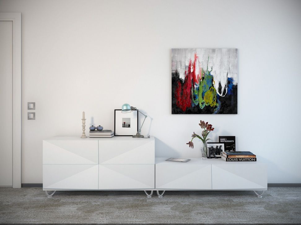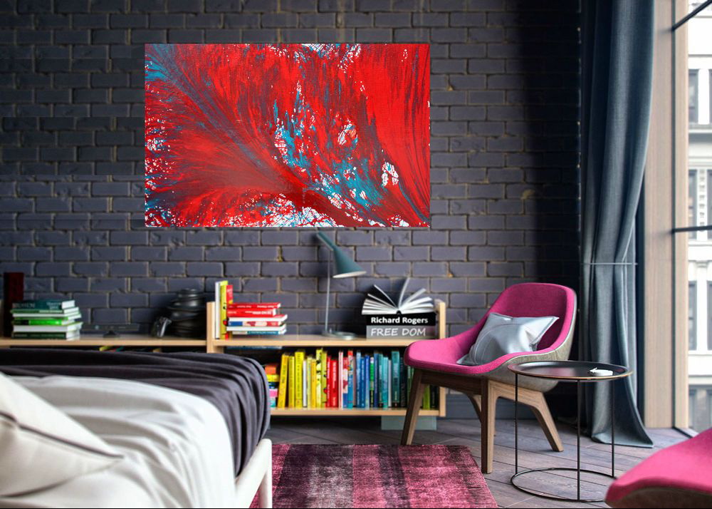Para tomar uma nova decisão no interior, escolha telas de tons brilhantes e suculentos.. Por exemplo, obras abstratas de vermelho rico ou cor de cal se encaixam perfeitamente em uma sala minimalista.