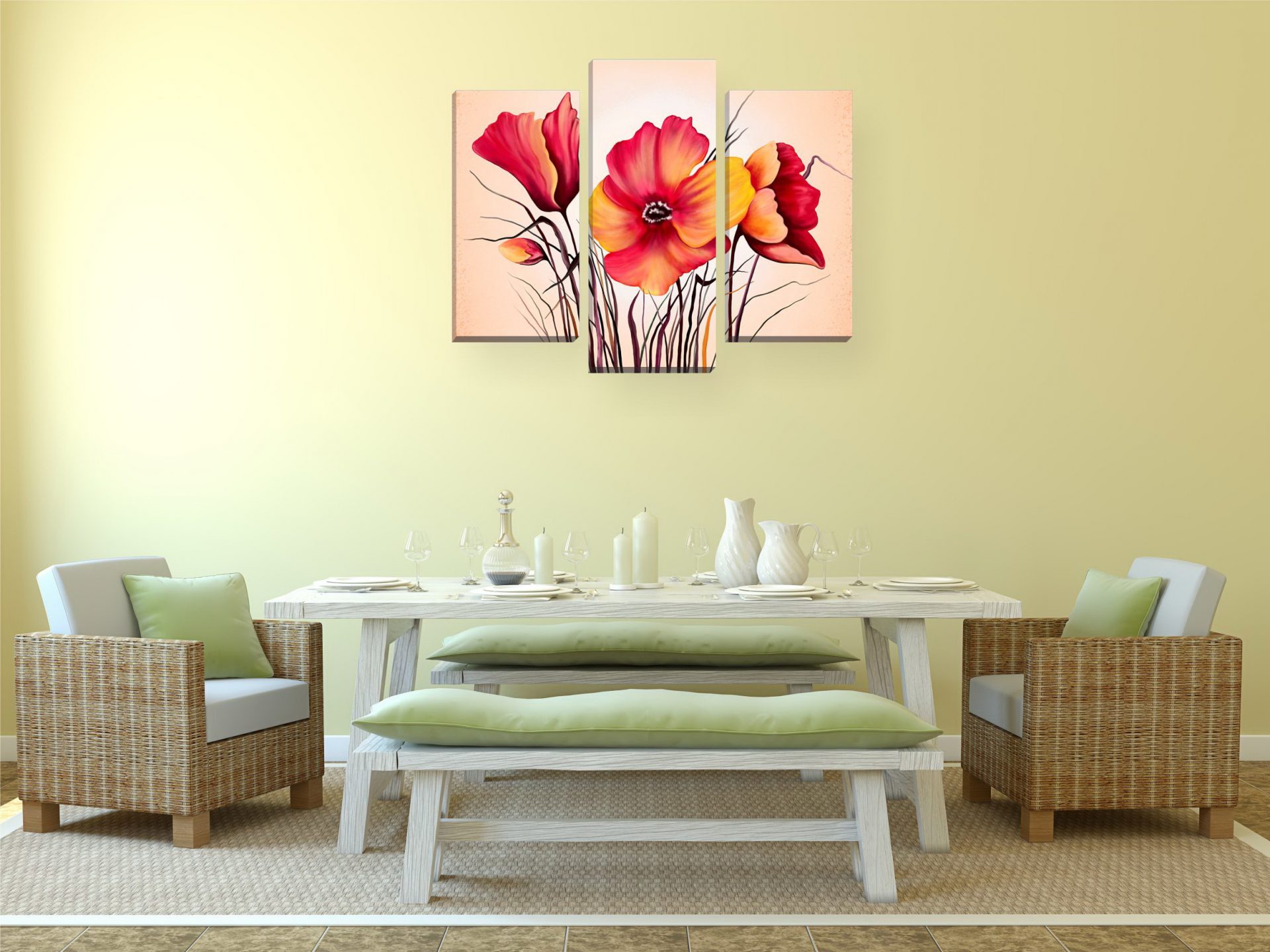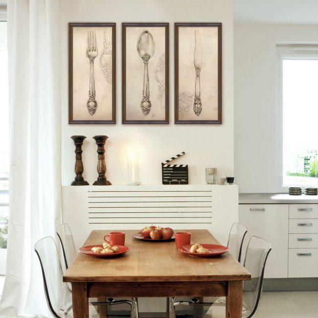 - Parcelas. A paleta e os lotes da sua cozinha podem ser completamente diferentes - tudo depende do seu gosto e do estilo da sala. Por exemplo, a culinária clássica é bem complementada por paisagens pintadas em óleo. Arranjos florais irá atender o interior provençal. Moderno ou alta tecnologia Você pode interessante reviver com desenhos abstratos.Mesmo se você quiser pendurar uma imagem com um tema culinário, ainda não se afaste do estilo geral interior.