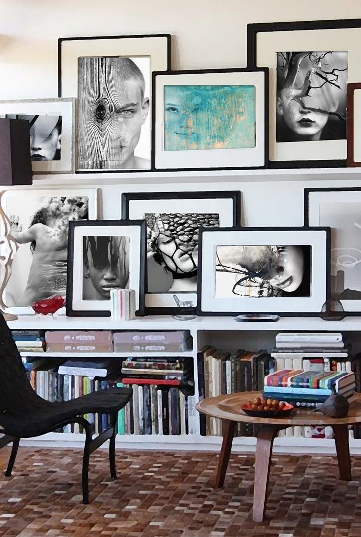 - Você pode fazer uma imitação da parede com cartazes, colocando fotos sem quadros.