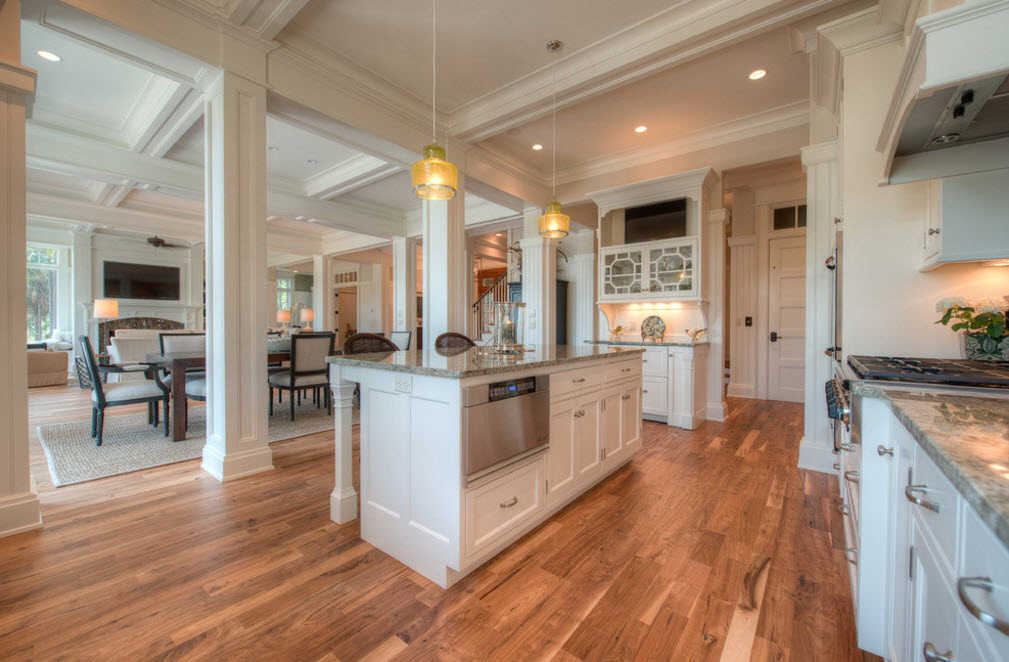 Se as dimensões permitirem, vale a pena separar a cozinha da sala de estar sem mobília, uma abertura arqueada, uma divisória deslizante ou uma tela. Sob o estilo clássico organicamente apto partição de madeira e uma abertura com colunas. Também é possível colocar entre os quartos um armário com livros até o teto para que uma pequena passagem permaneça.