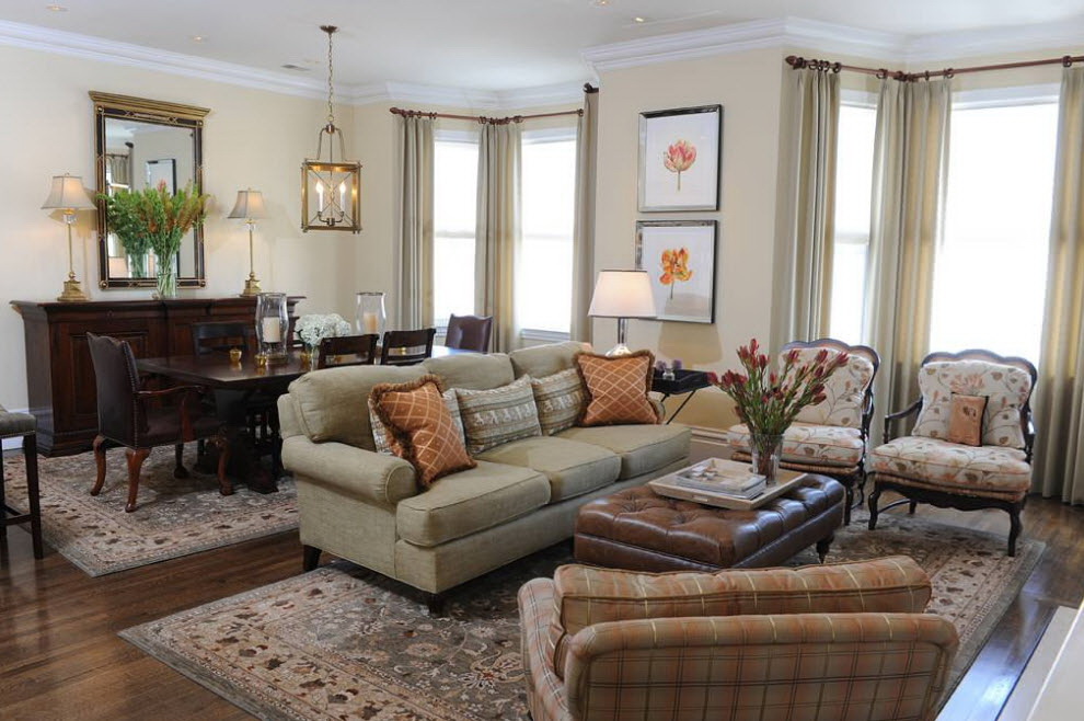 Se o espaço permitir, vale a pena fazer várias zonas na sala de estar de uma só vez, onde você pode relaxar, tomar chá, conversar, divertir-se e assim por diante. No estilo clássico, como em muitos outros, permite que você faça o zoneamento de móveis - parede do armário, sofá ou tela.