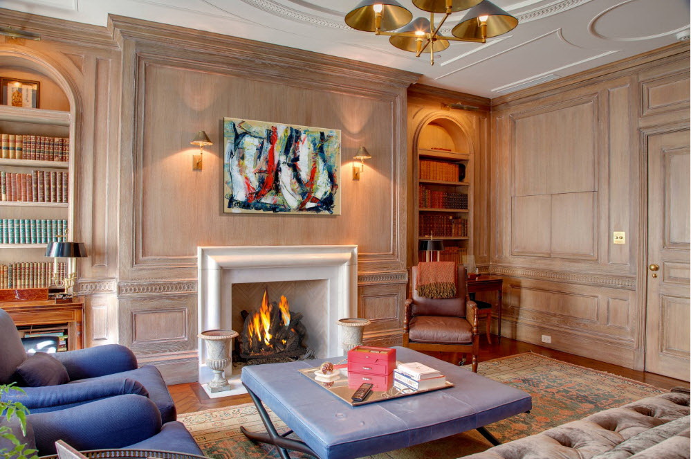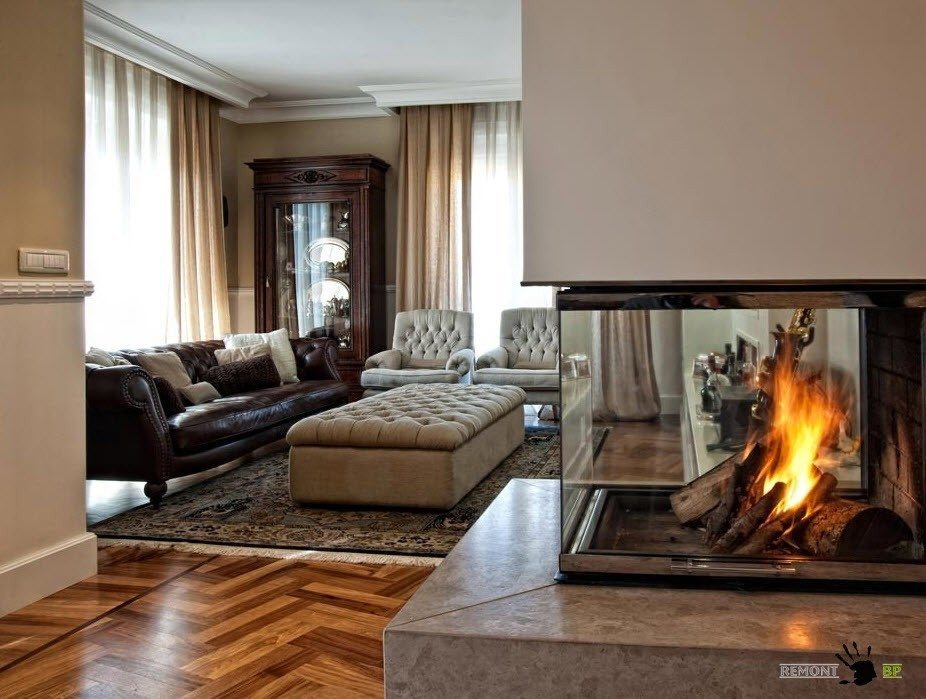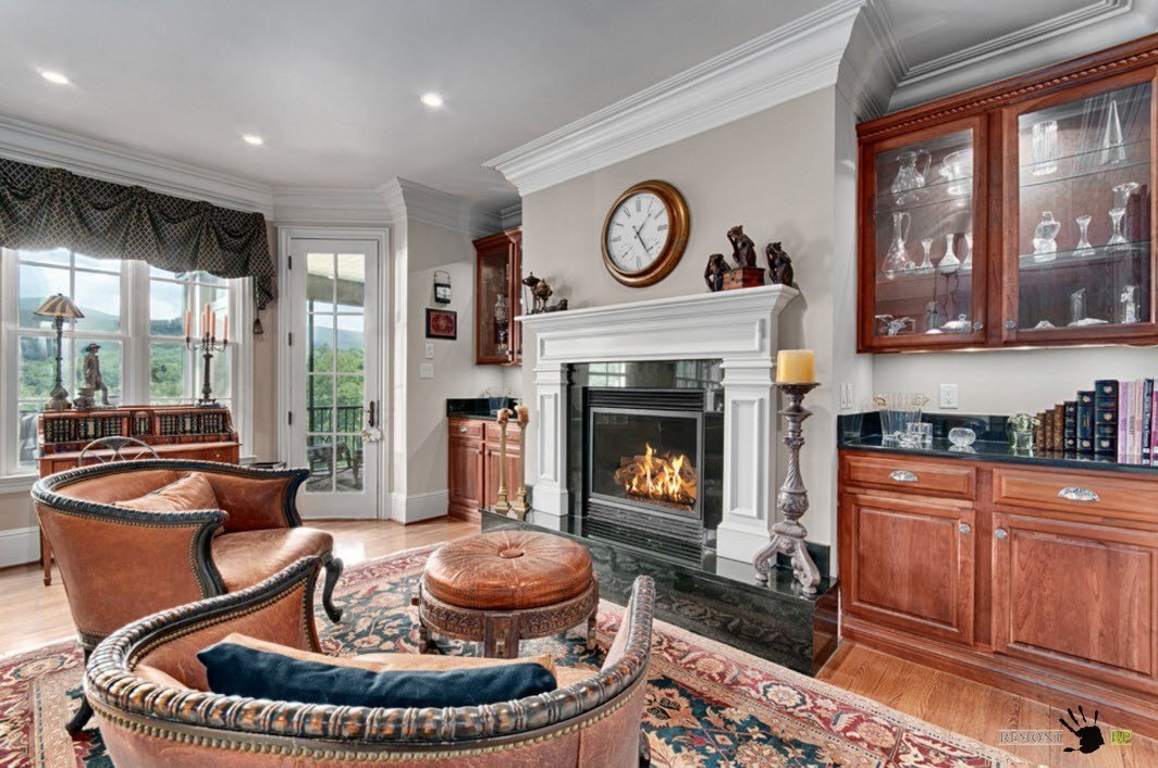 No estilo clássico do interior, qualquer modelo da lareira deve ser colocado perto da parede em branco, não exatamente no canto da sala, para que ela possa aquecer totalmente a sala. Para os grandes quartos, uma enorme lareira em forma de U é perfeita para aproveitar ao máximo as chamas. A decoração do modelo clássico deve corresponder à sala - pedra natural, decoração forjada e detalhes esculpidos.