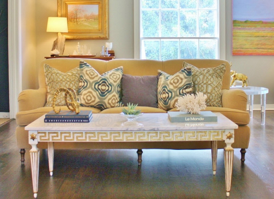 O sofá deve parecer chique e de bom gosto, estofado em tecidos caros, decorados com materiais naturais.