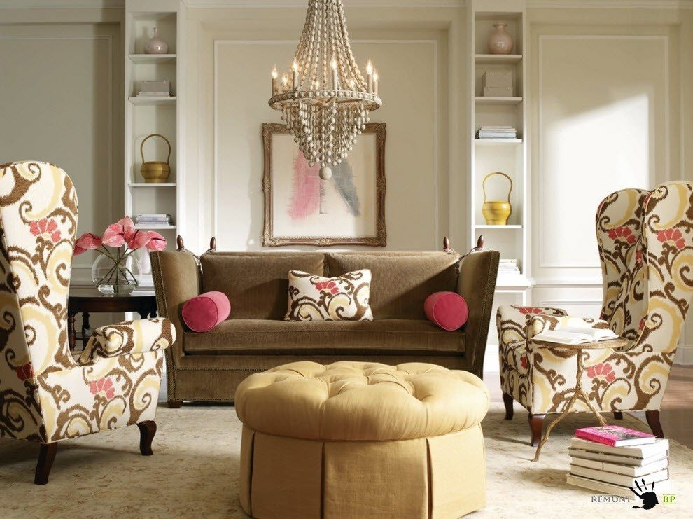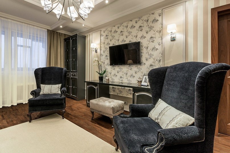 No clássico, você pode usar com segurança os dois tipos de móveis, mas é importante que eles sejam feitos de materiais naturais. Estofamento de móveis também deve ser caro e confortável, porque é necessário que o design permaneça completamente confortável e confiável. Se possível, compre cadeiras e poltronas em um conjunto com um sofá, pois isso permitirá que você observe melhor a integridade do design.