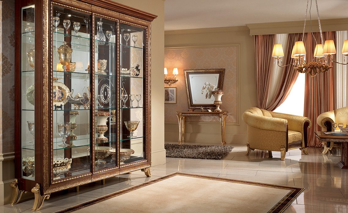 Tais gabinetes podem ser complementados com janelas para armazenar itens valiosos e bonitos por trás do vidro, para que os proprietários possam sempre mostrá-los aos seus convidados. Pilastras, capitais e, especialmente, espelhos de corpo inteiro que permitem aumentar visualmente o tamanho de uma pequena sala também parecerão muito apropriados. Para tais salas de estar, a propósito, vale a pena tomar um armário de esquina longo.