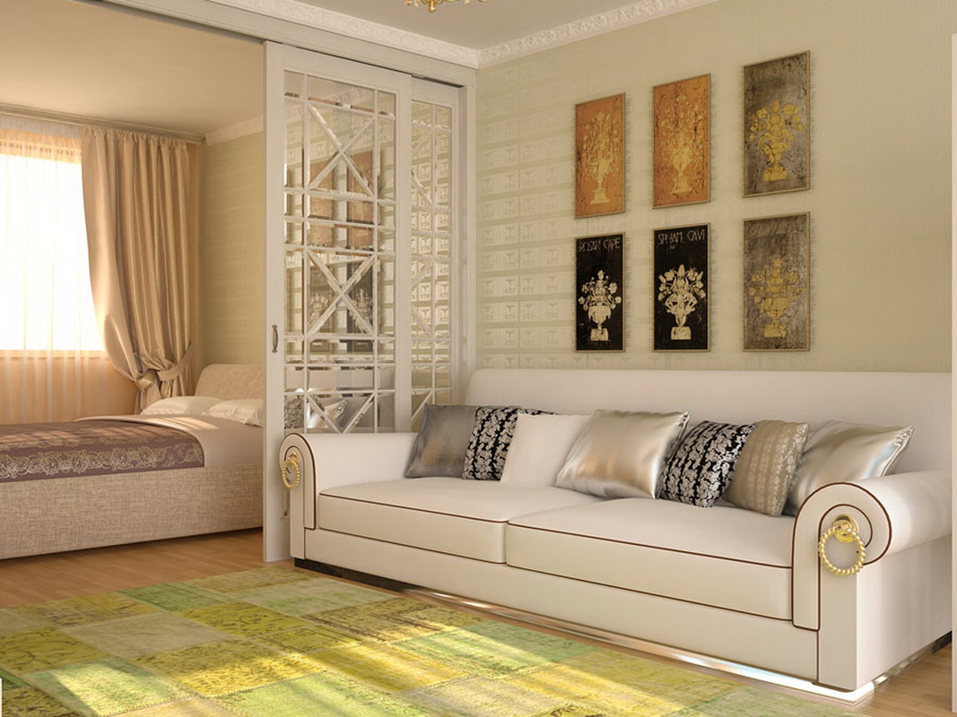 Além de socializar, entretenimento e beber chá, a sala de estar pode ser usada como um quarto para um quarto, geralmente neste caso os hóspedes e os hóspedes passam as noites lá. Ao contrário da sala de estar, a cozinha é suficiente para instalar a cama, guarda-roupas e poltronas em diferentes partes da sala, sem zonear com mobília adicional. É possível organizar em absoluto só uma área de dormir de hóspedes com uma cama, pequeno guarda-roupa e uma mesa de café.