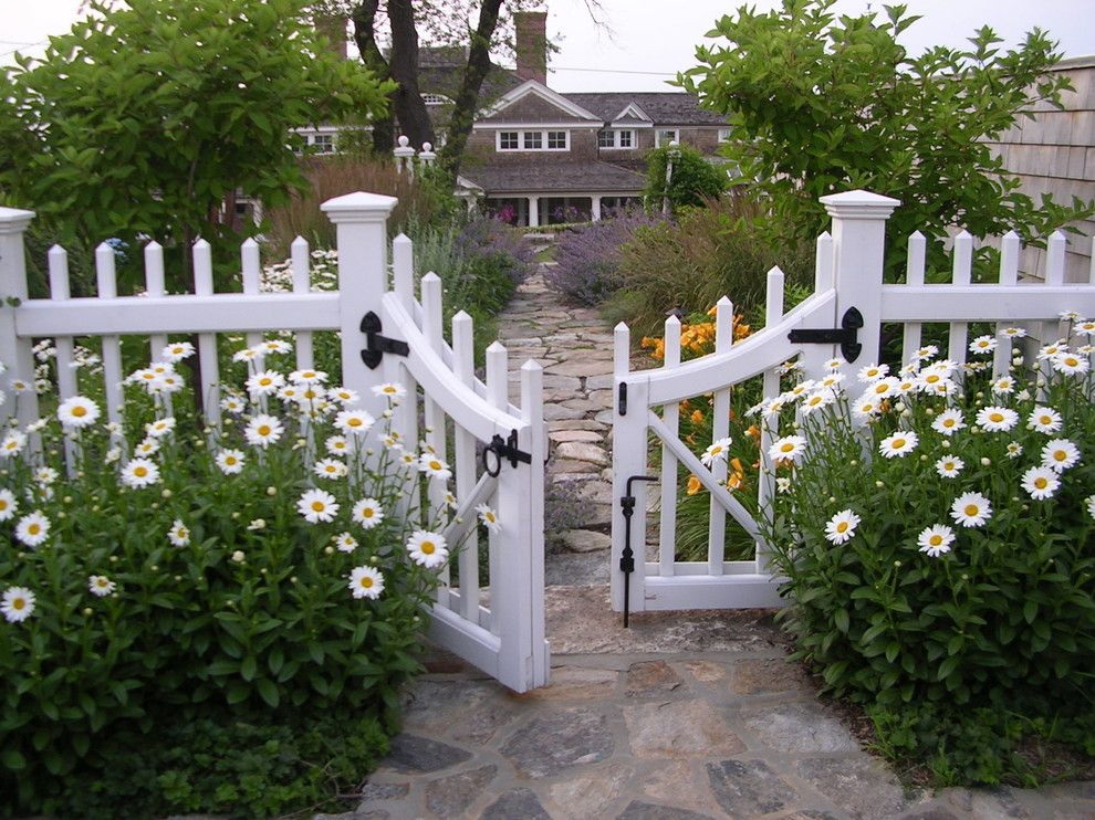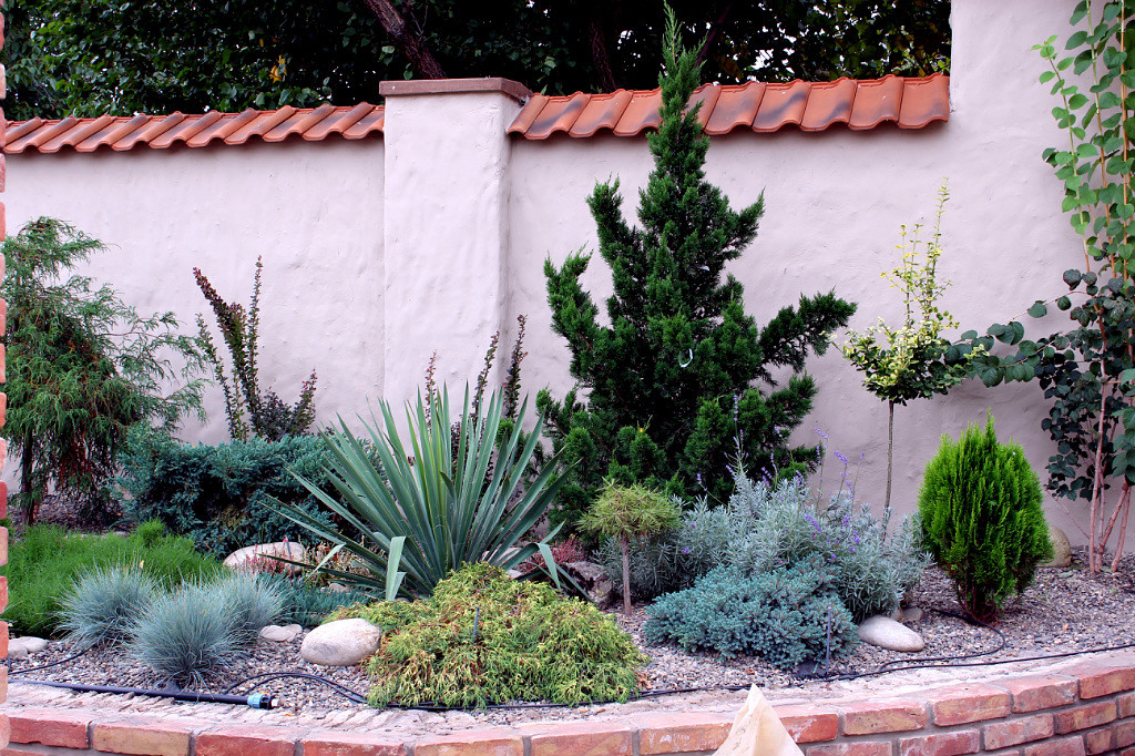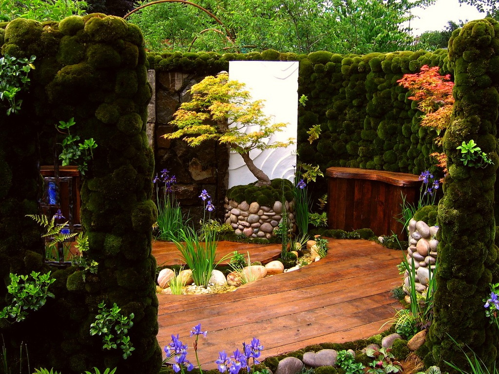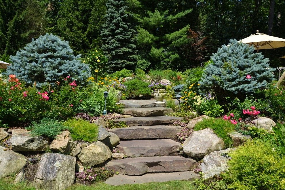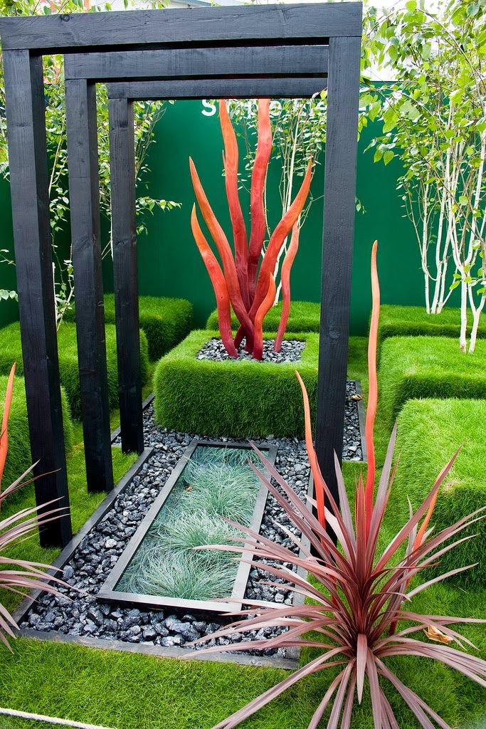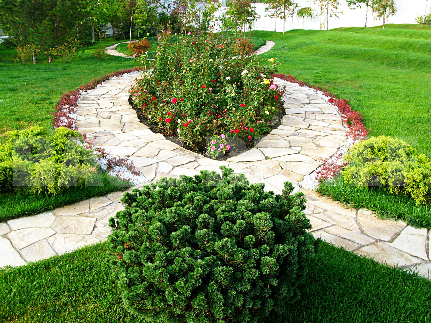 Pinheiros, aparados em uma forma triangular, criam interesse visual. Anuários, plantas perenes fornecem o jardim com cores brilhantes e formas interessantes. Aqui, o gladíolo claramente contrasta com a folhagem e flores ao redor deles. Listras coloridas grandes criarão uma atmosfera relaxante para este jardim.
